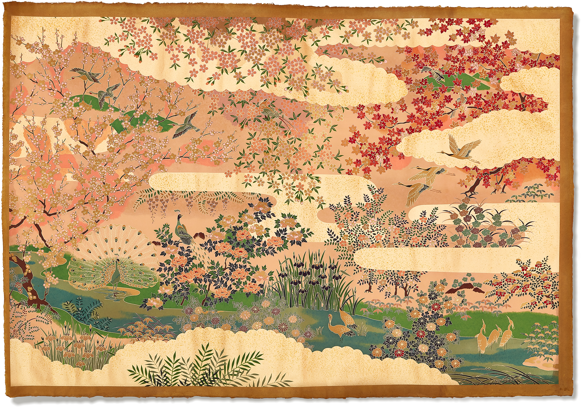 Full-Panel Chiyogami Silk Screen Print, Gold Peacock