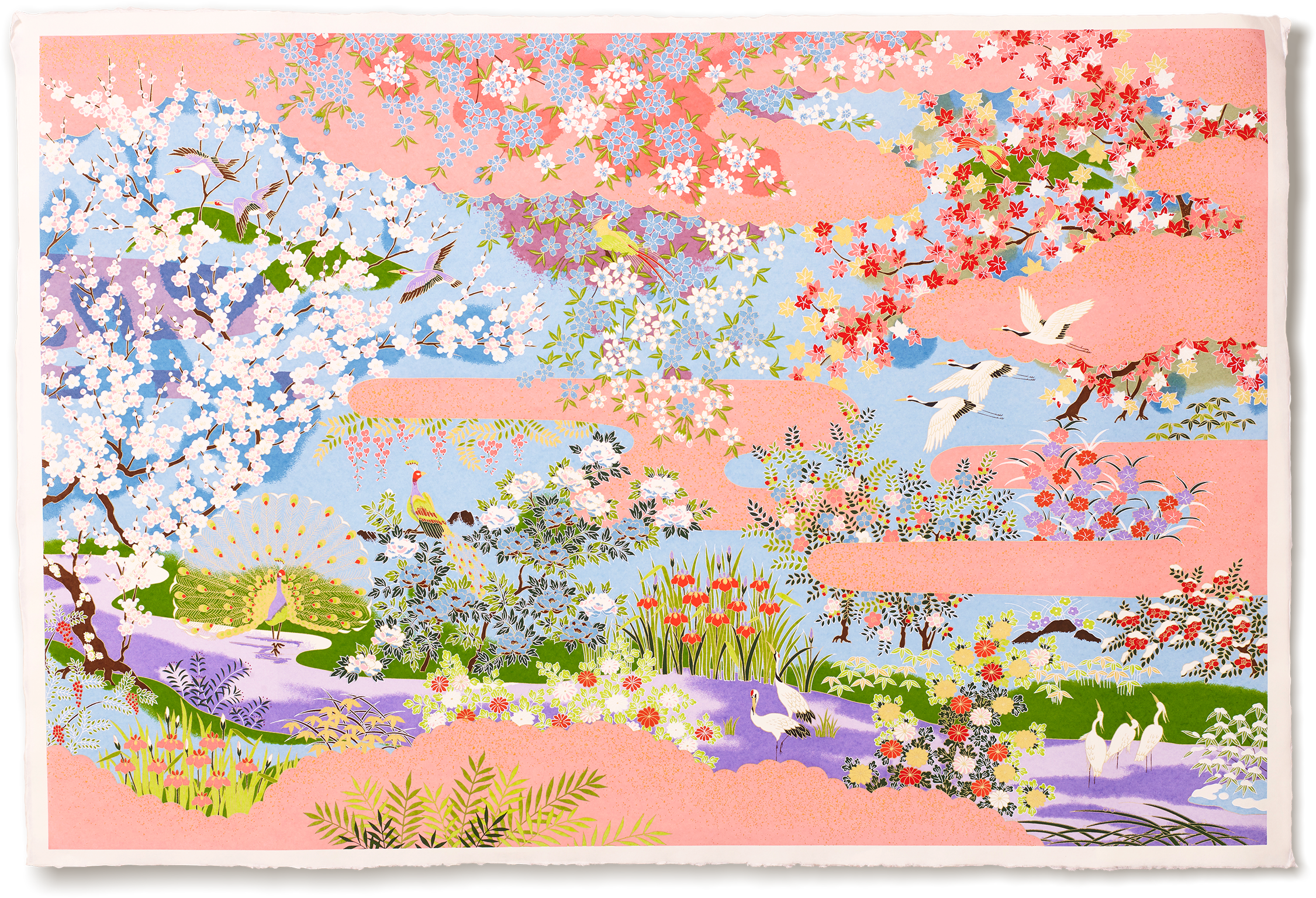 Full-Panel Chiyogami Silk Screen Print, Pink Peacock