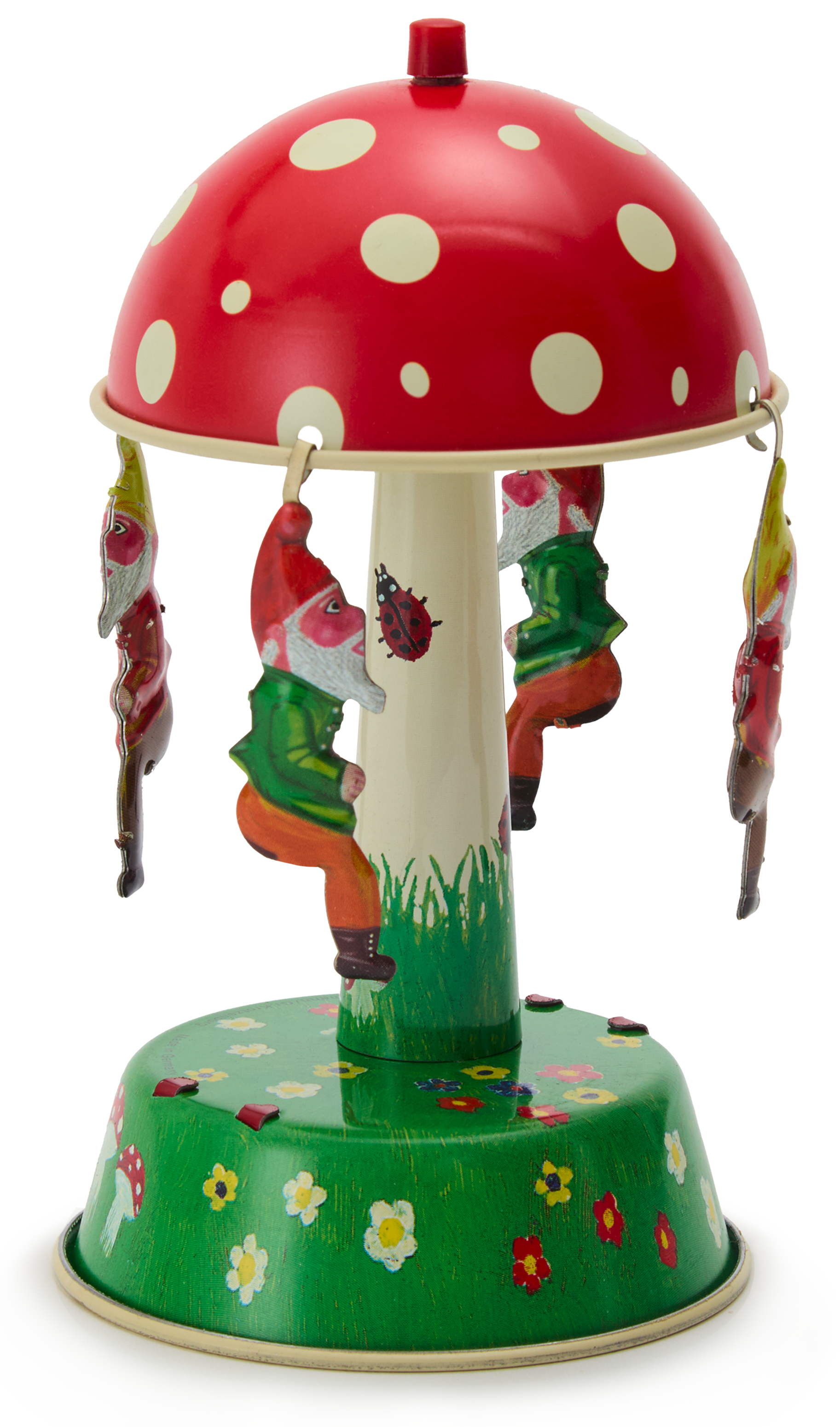 Four mischievous gnomes spin under the big red mushroom cap, amid bugs and flowers... A traditional tin toy with a completely analogue spinning mechanism aided by a tiny key - get this for its ultimate nostalgia factor and cottage core aesthetic.