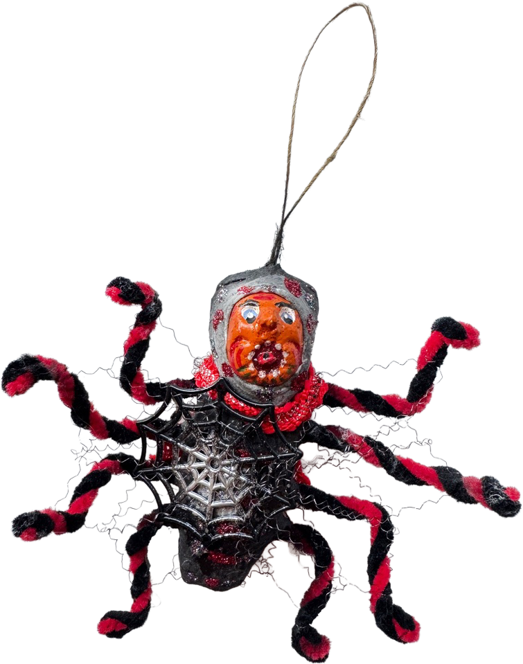 These Spun Cotton Dolls are faithful replicas of ornaments from a bygone era - originating in 19th and early 20th century Germany. These were made by hand with cotton wadding around wire shapes and adorned with Dresden scrap embossed papers and other hand fashioned props, often featuring mushrooms Gluckspilz, a little trinket for luck. The porcelain faces used are original antique doll parts, which are extraordinarily secured some 100 years after they were disposed of as second quality or faulty by the doll makers of the past in the local village woods somewhere in Eastern Germany. Today in one of the strangest weekend hobbies, these are dug up like treasure by locals, or porcelain-foragers as we like to think of them, for your enjoyment. Surely the fact that each face has been buried in dirt for decades, destined to be forgotten, and brought back to life, given a new body and clothes, adds to their very eery, sometimes outright frightening demeanour and kooky form.