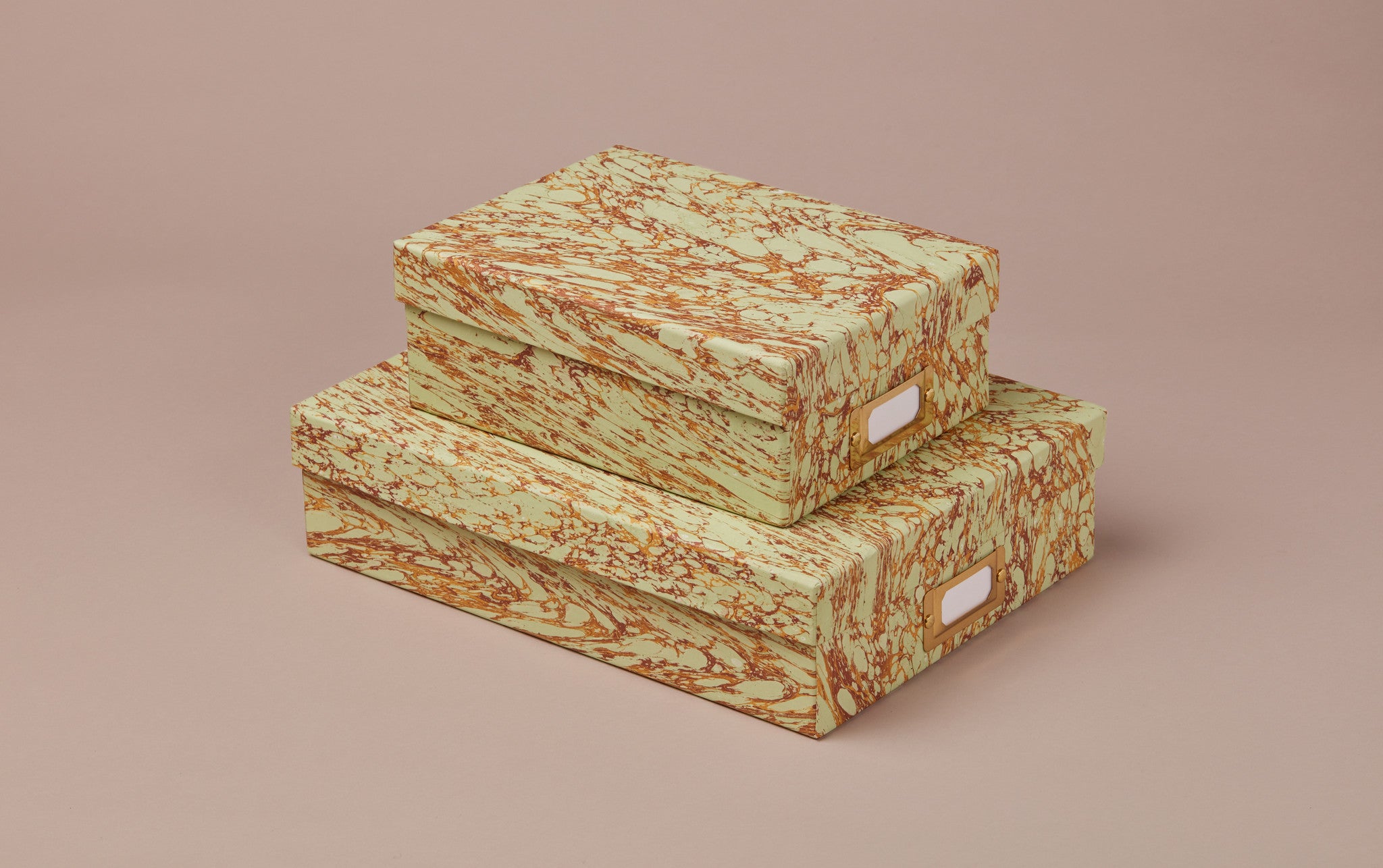 Presented here are handmade boxes, available in 9 marble motifs - each is handmade, lined inside (with creme paper) and using hand marbled paper to cover. There is also a brass label holder on each box to make note of its contents.