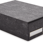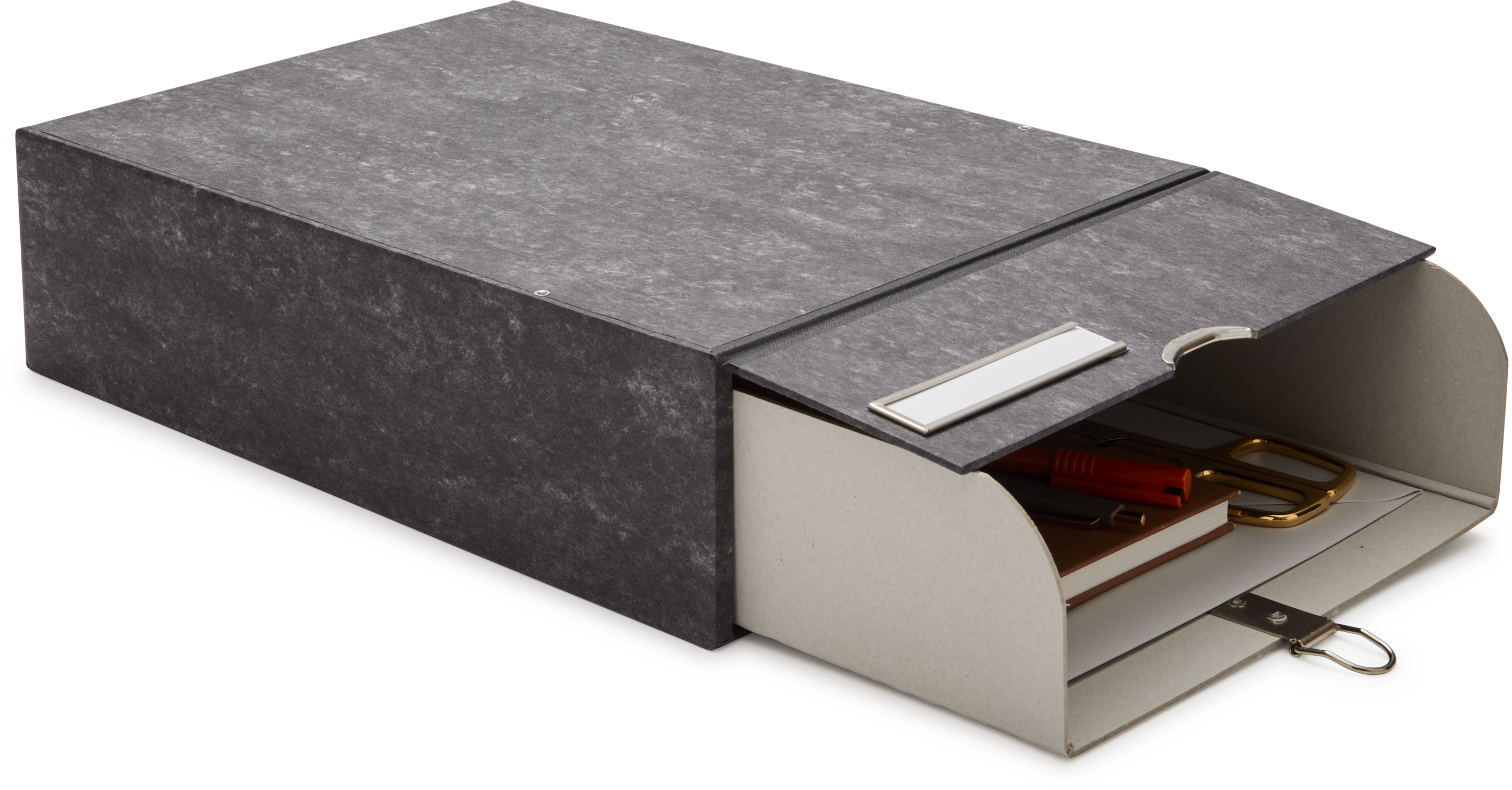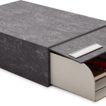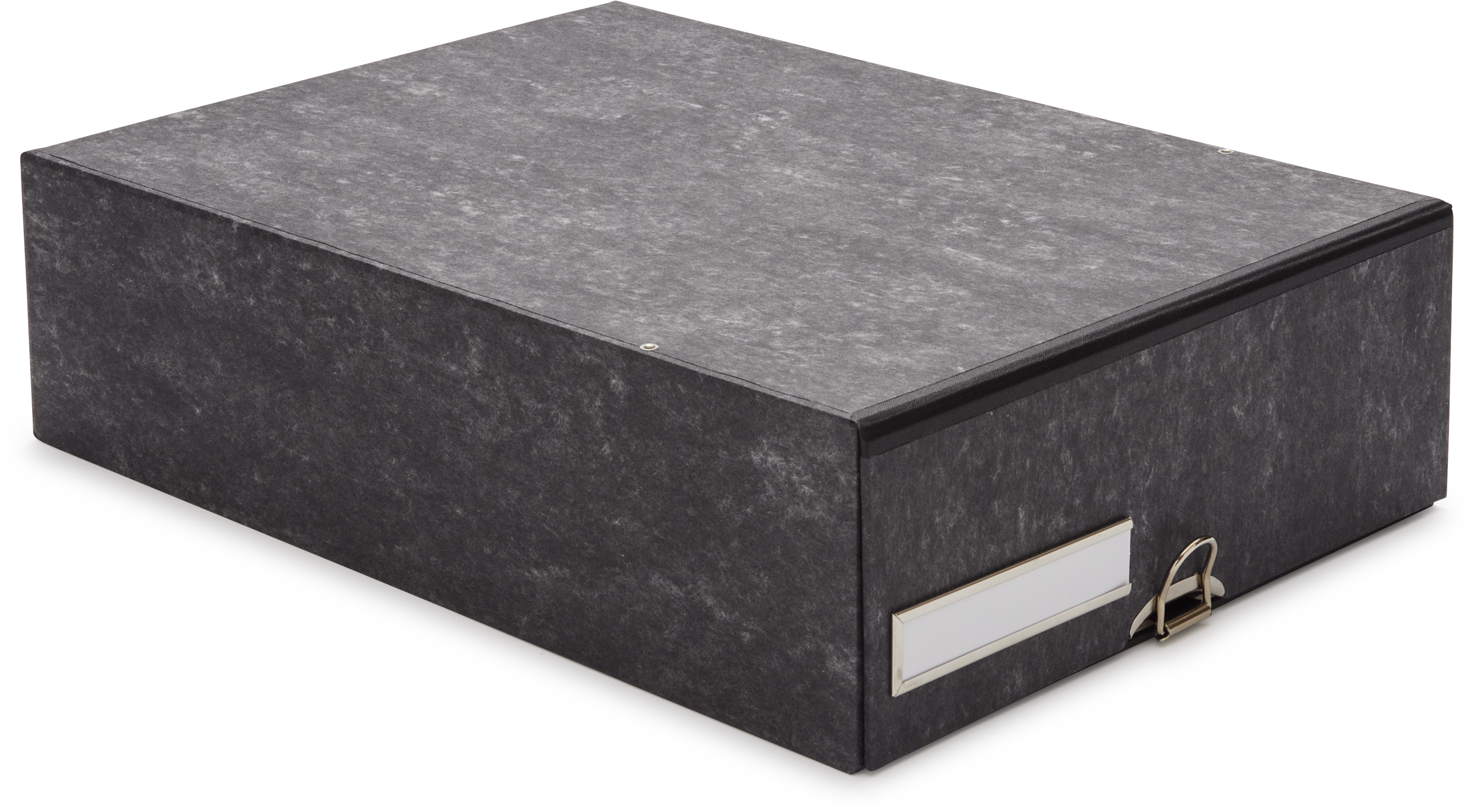 A new addition to our in-house range, please meet the ultimate box for your archival needs. The outer construction is completely rigid - unclip the front chrome fastener and out comes a drawer to contain documents and other bits - push the drawer back in and everything is neatly stored back in.