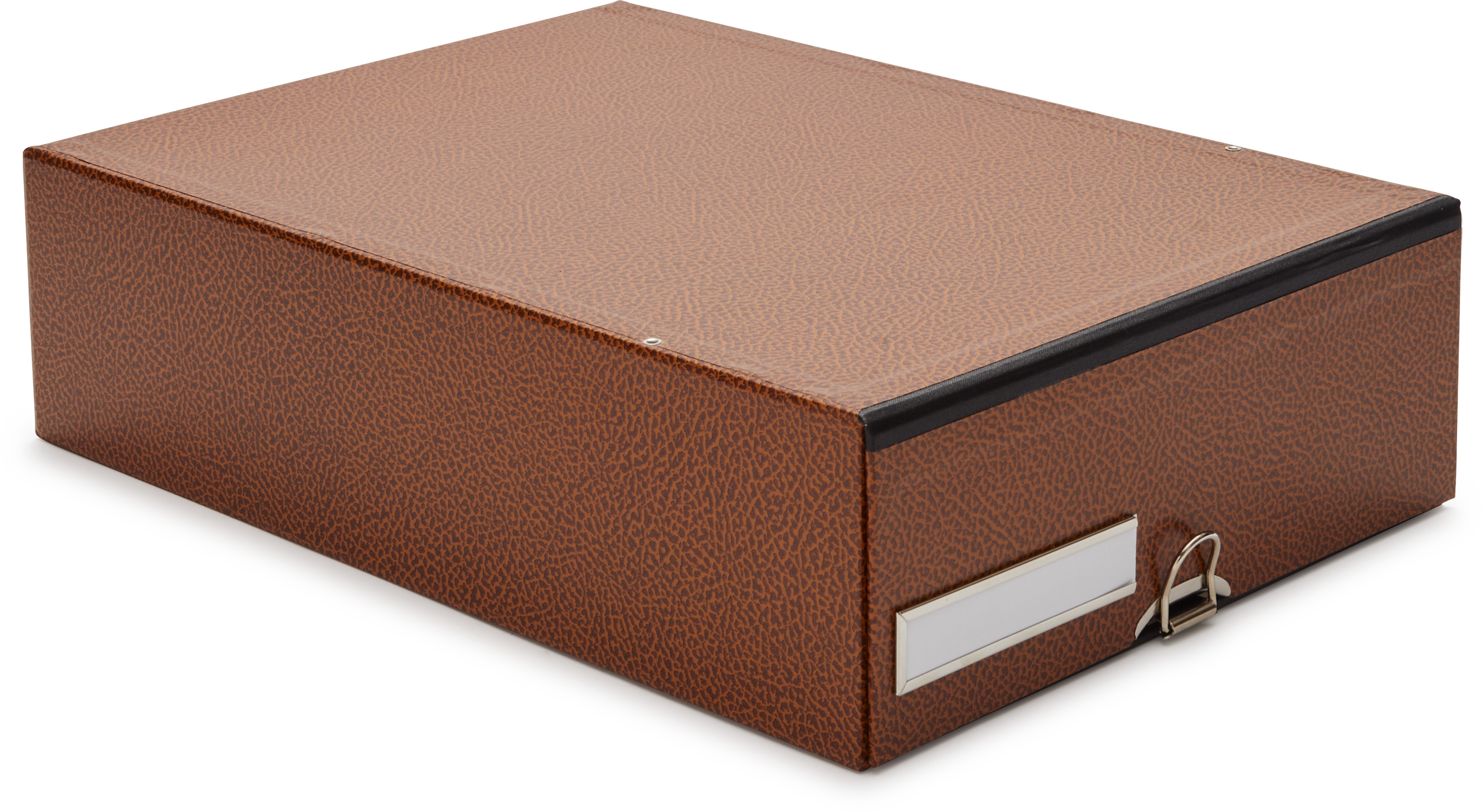 A new addition to our in-house range, please meet the ultimate box for your archival needs. The outer construction is completely rigid - unclip the front chrome fastener and out comes a drawer to contain documents and other bits - push the drawer back in and everything is neatly stored back in.