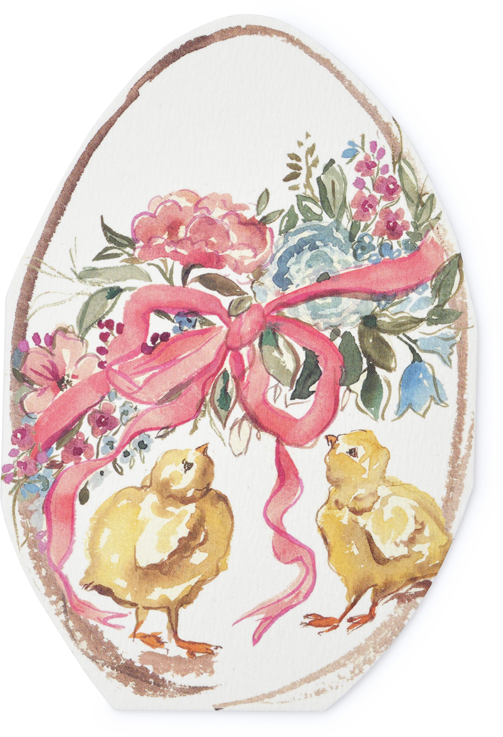 Two chicks gather beneath a ribbon and floral wreath in this charming Easter card. Printed from a watercolour illustration, the card has been carefully die-cut and will make a sweet addition to your Easter correspondence and gifting.