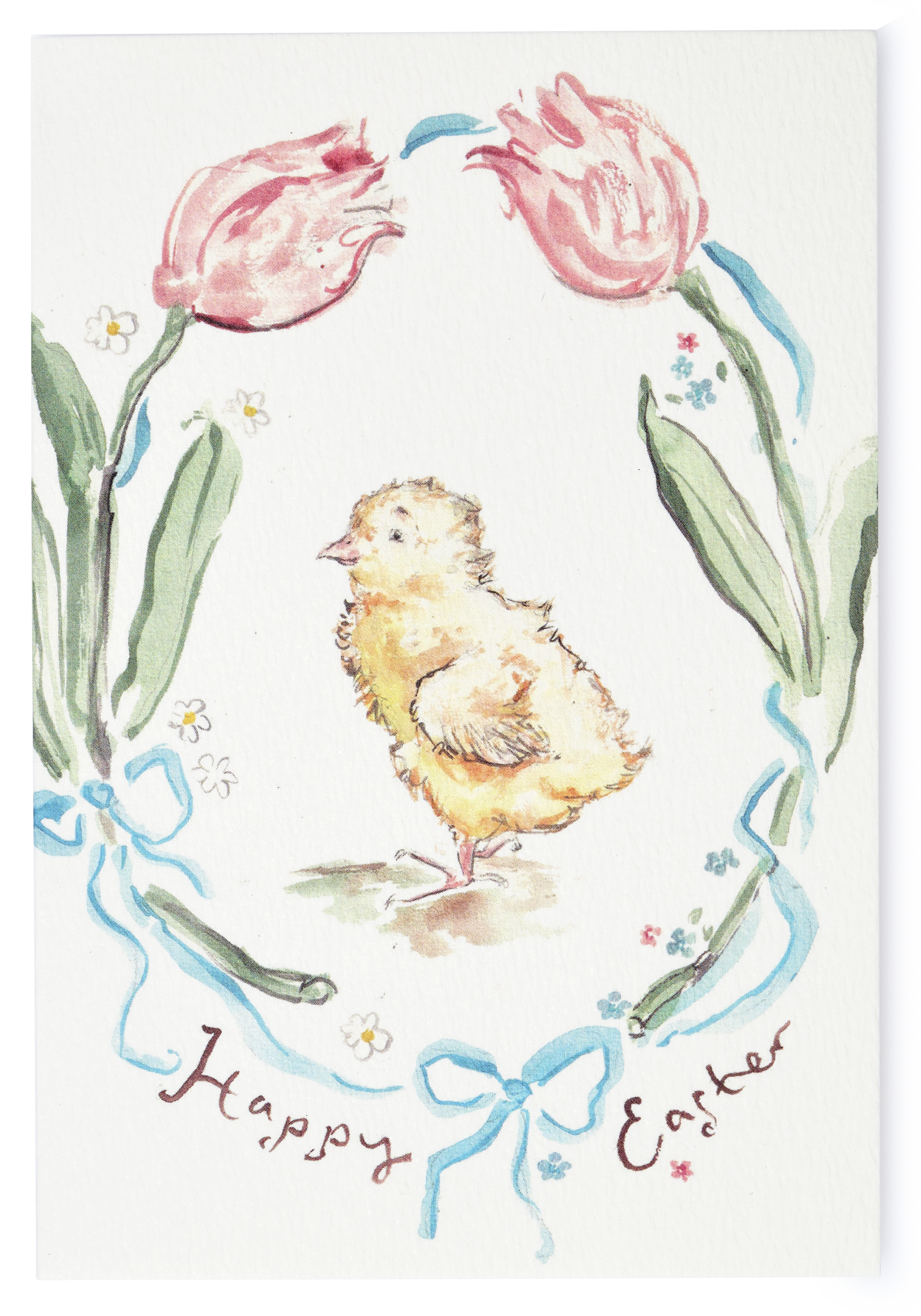 This dear chick in a circle of tulips wishes you a Happy Easter. Printed from a watercolour illustration, the card will make a sweet addition to your Easter correspondence and gifting.