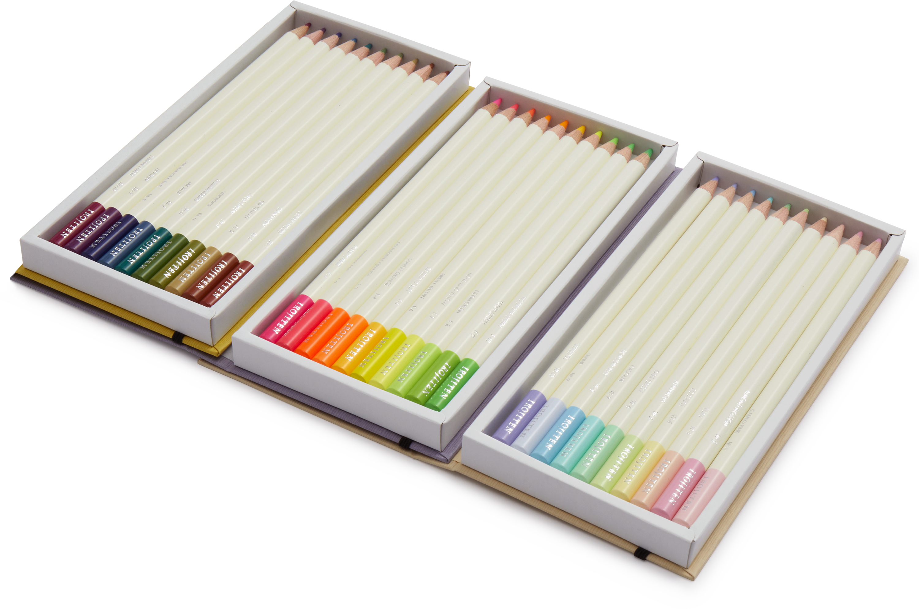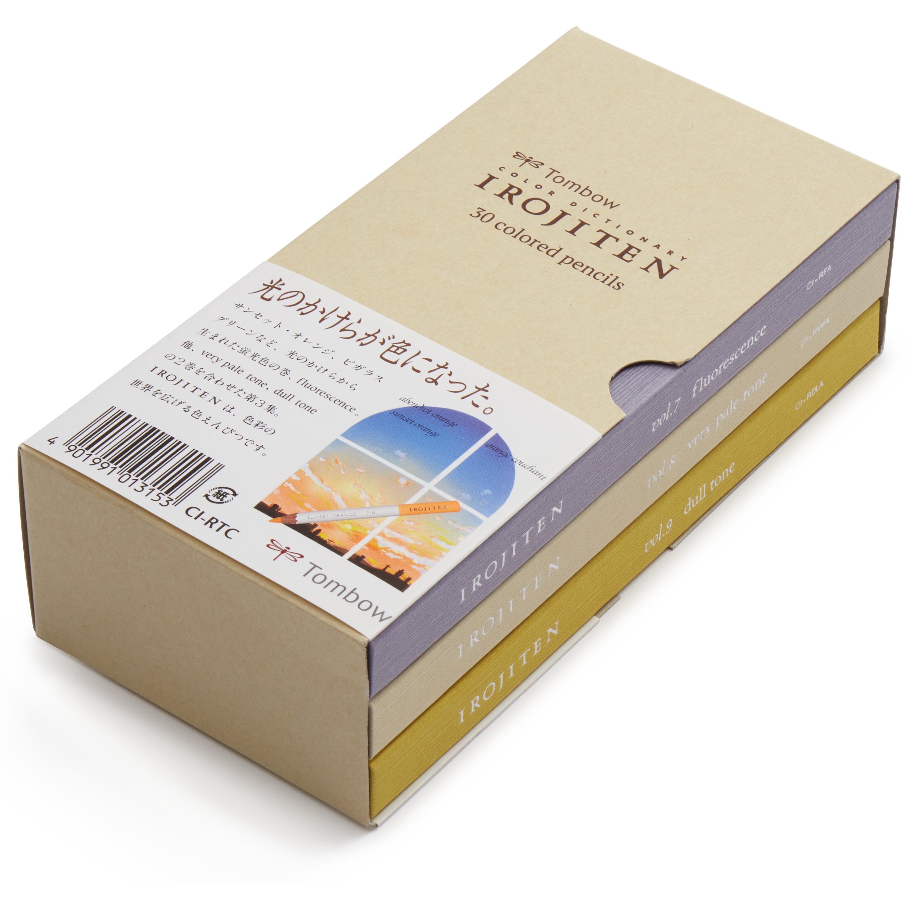This is the third of a three part colour pencil set from Japan, entitled “_Irojten_” which roughly translates as “Colour Encyclopaedia” or “Colour dictionary”. Each set, containing 30 pencils, has been thoughtfully designed to contain the necessary palette of colours to capture the essence of a landscape. Part 3, containing volumes Fluorescence, Very Pale Tone, and Dull Tone represent the colours of the Sea and its surroundings.