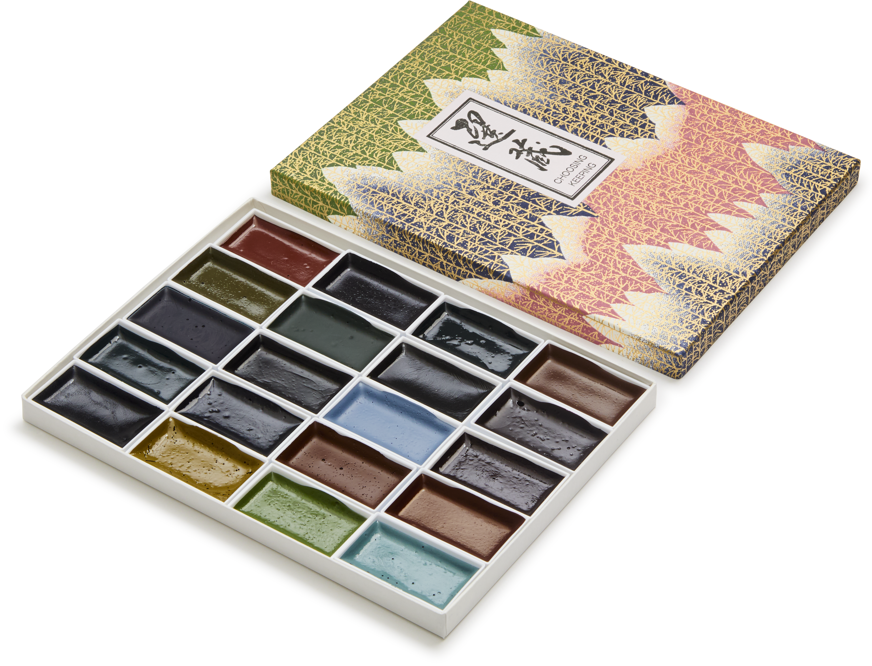 Each is delivered in an attractive silk screen printed Japanese paper depicting mountains - a wink to Sōtō Zen Buddhist thought as expressed by Eihei Dogen (1200-1253) in Sansui Kyo's aka Mountains and Waters Sutra - an existentialist contemplation of mountains and rivers as the very expression of the Buddha; and the perfect philosophical partner and instigator for the development and use of this paint set.