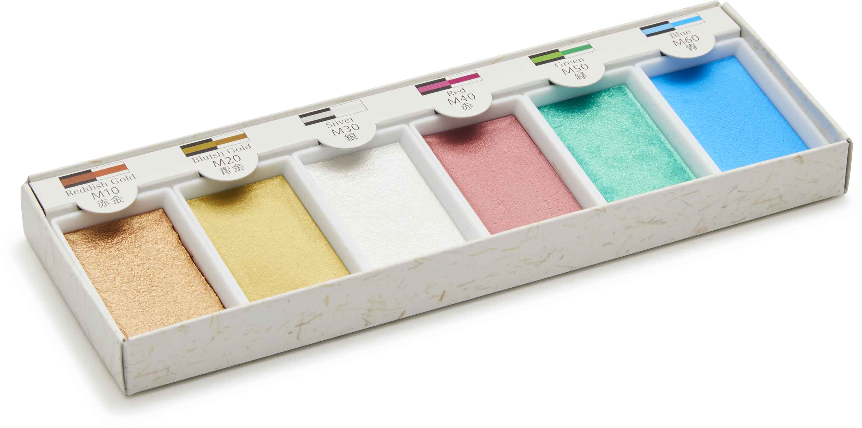 Enjoy 6 shades of Gansai in your art practicethe Japanese alter-ego to European watercolours - also similar to gouaches. These high quality paints, made in Japan by a 100 year old paint maker, can be used directly out of the box with a wet paintbrush - either thinly in translucent washes, or by layering for a bolder effect. These can also be used on darker paper bases.