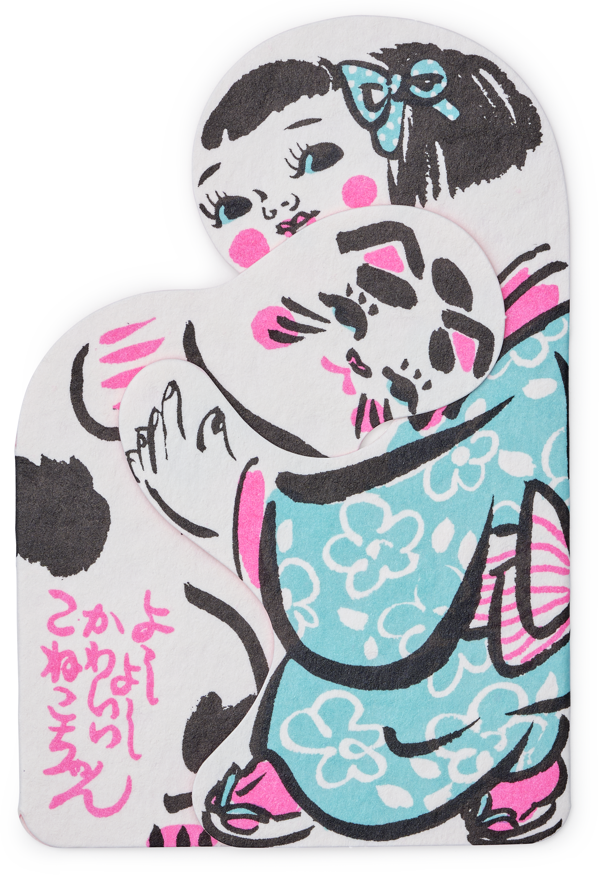 An extremely cute card depicting a girl with her cat in a tender embrace - unlock their arms and paws to reveal a message inside! Risograph printed from a simple brushwork illustration, this card is carefully die-cut to open and close the "hug".