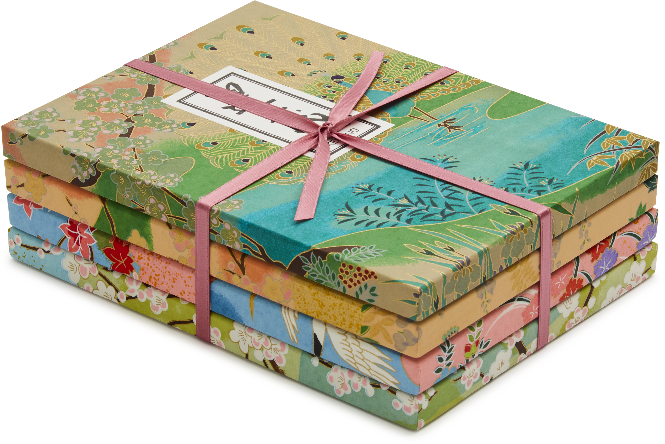 Each season comes in a matching box covered in luxury silk screen printed Japanese paper. Each box is made from a different segment of the print and so the pattern may vary.