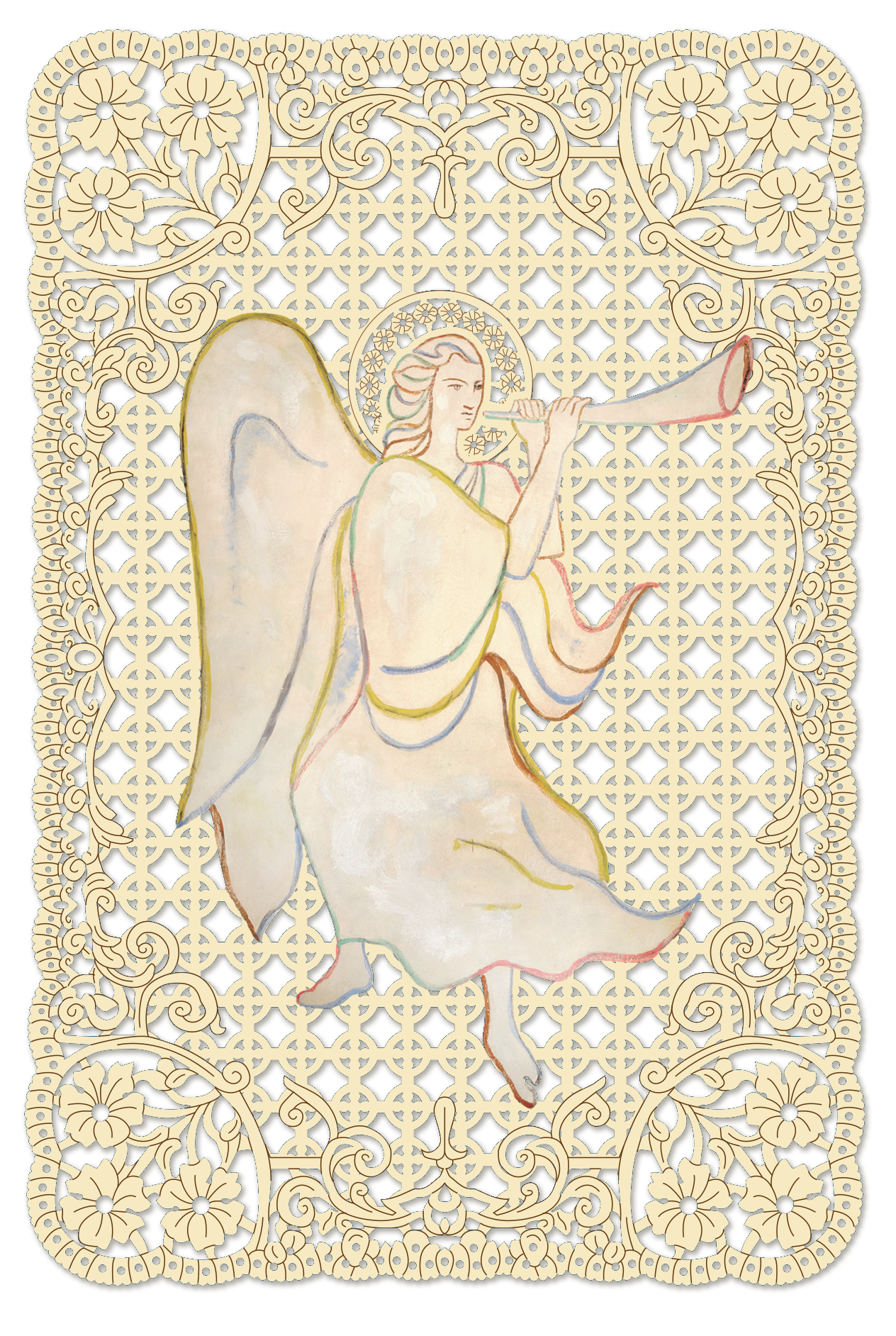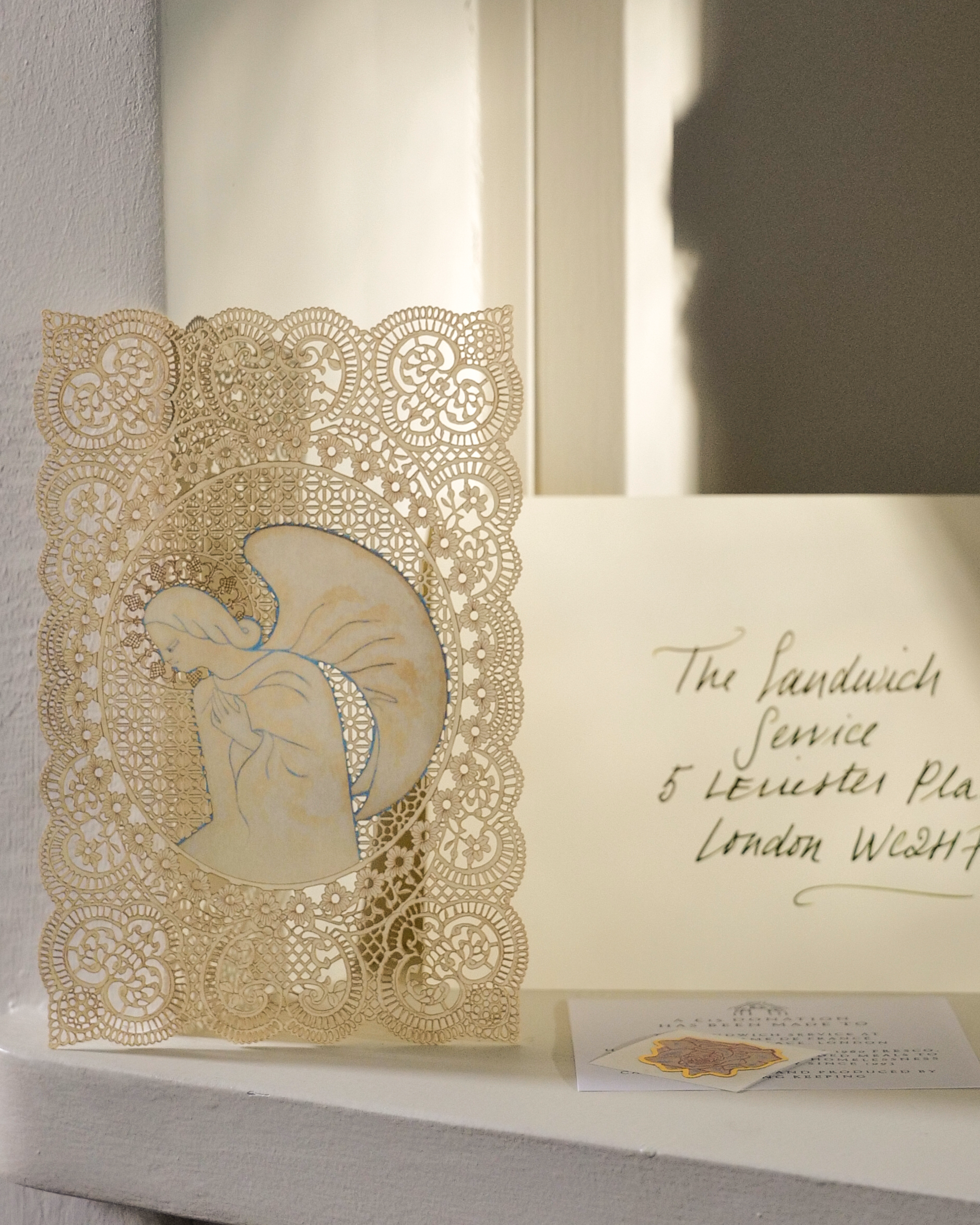 Taking inspiration from Jean Cocteau's extraordinary artwork which lines the walls of the church, Choosing Keeping has designed a bespoke charity Christmas card that integrates elements from Cocteau’s fresco into the shop’s signature lace paper design. The card can be sent to a friend to mark a donation made in their name, or kept as a personal prayer card.