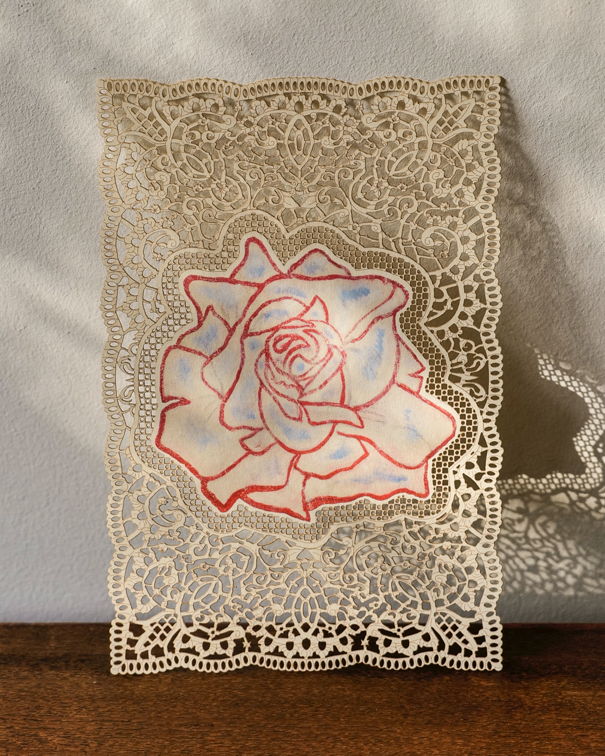 Taking inspiration from Jean Cocteau's extraordinary artwork which lines the walls of the church, Choosing Keeping has designed a bespoke charity Christmas card that integrates elements from Cocteau’s fresco into the shop’s signature lace paper design. The card can be sent to a friend to mark a donation made in their name, or kept as a personal prayer card.