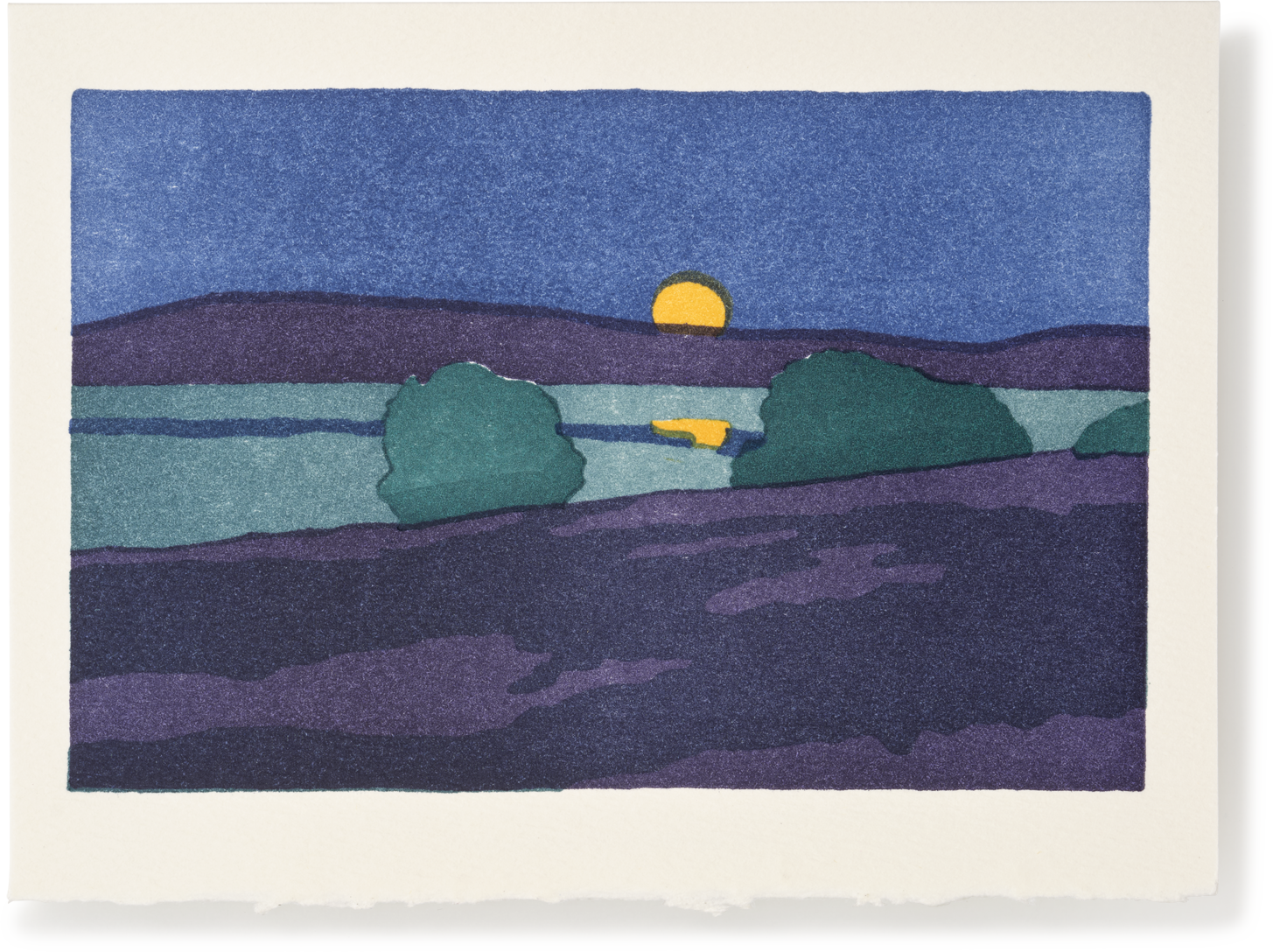 A peaceful depiction of the full moon in the landscape, this card was hand-printed on a traditional printing press and can suit multiple occasions, including bereavement.