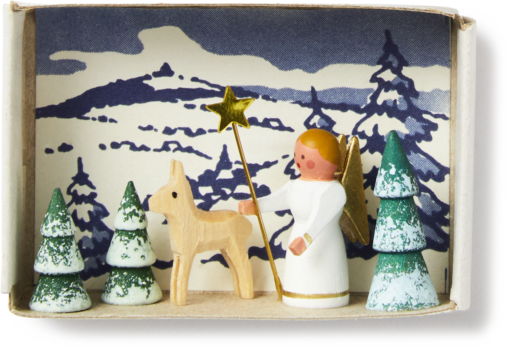 An incredibly detailed winter scene in a matchbox, this small delightful object is made entirely by hand. In the tradition of Eastern German Erzgebirge region, wooden Christmas items relate to old European Folklore themes and should be considered as such - half way between outsider art and indigenous folklore.