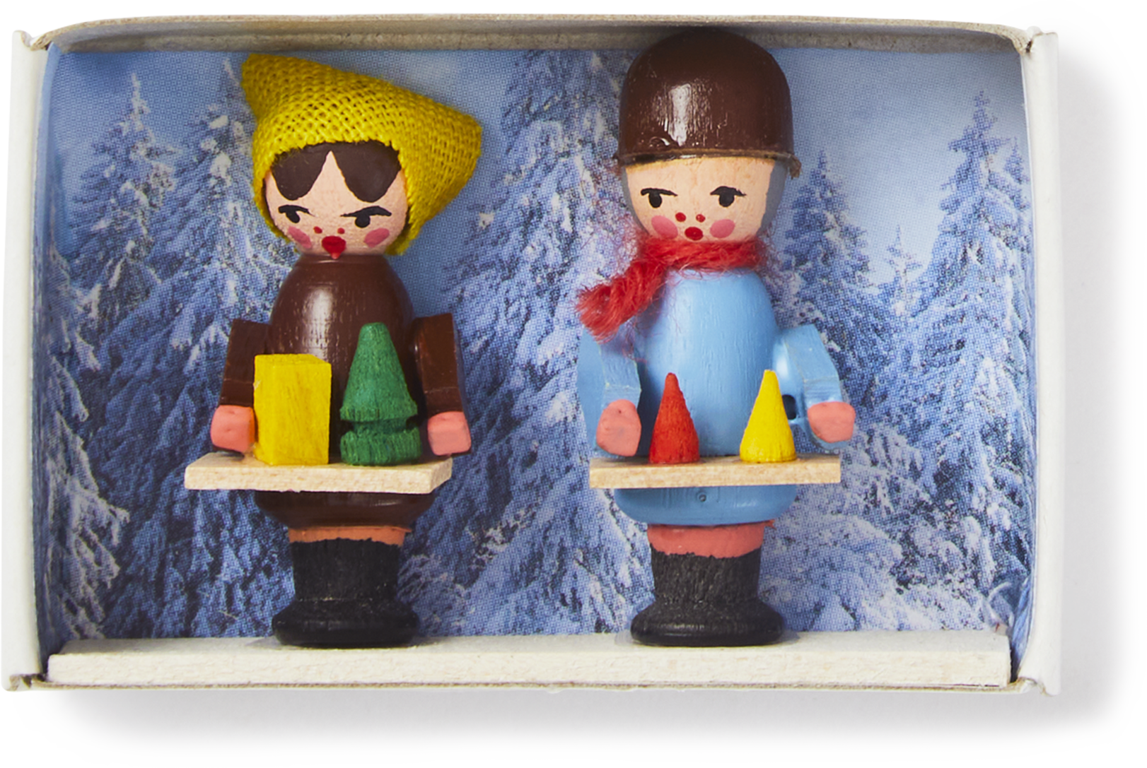 An incredibly detailed winter scene in a matchbox, this small delightful object is made entirely by hand. In the tradition of Eastern German Erzgebirge region, wooden Christmas items relate to old European Folklore themes and should be considered as such - half way between outsider art and indigenous folklore.