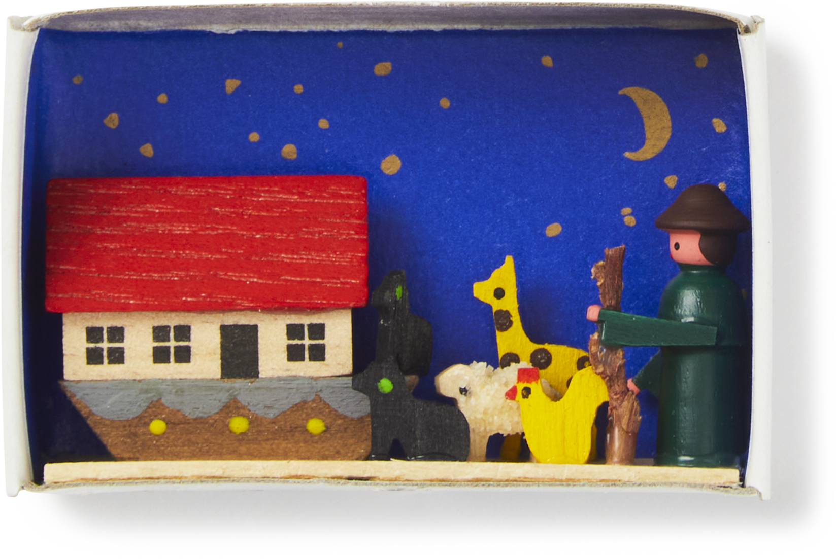 An incredibly detailed winter scene in a matchbox, this small delightful object is made entirely by hand. In the tradition of Eastern German Erzgebirge region, wooden Christmas items relate to old European Folklore themes and should be considered as such - half way between outsider art and indigenous folklore.