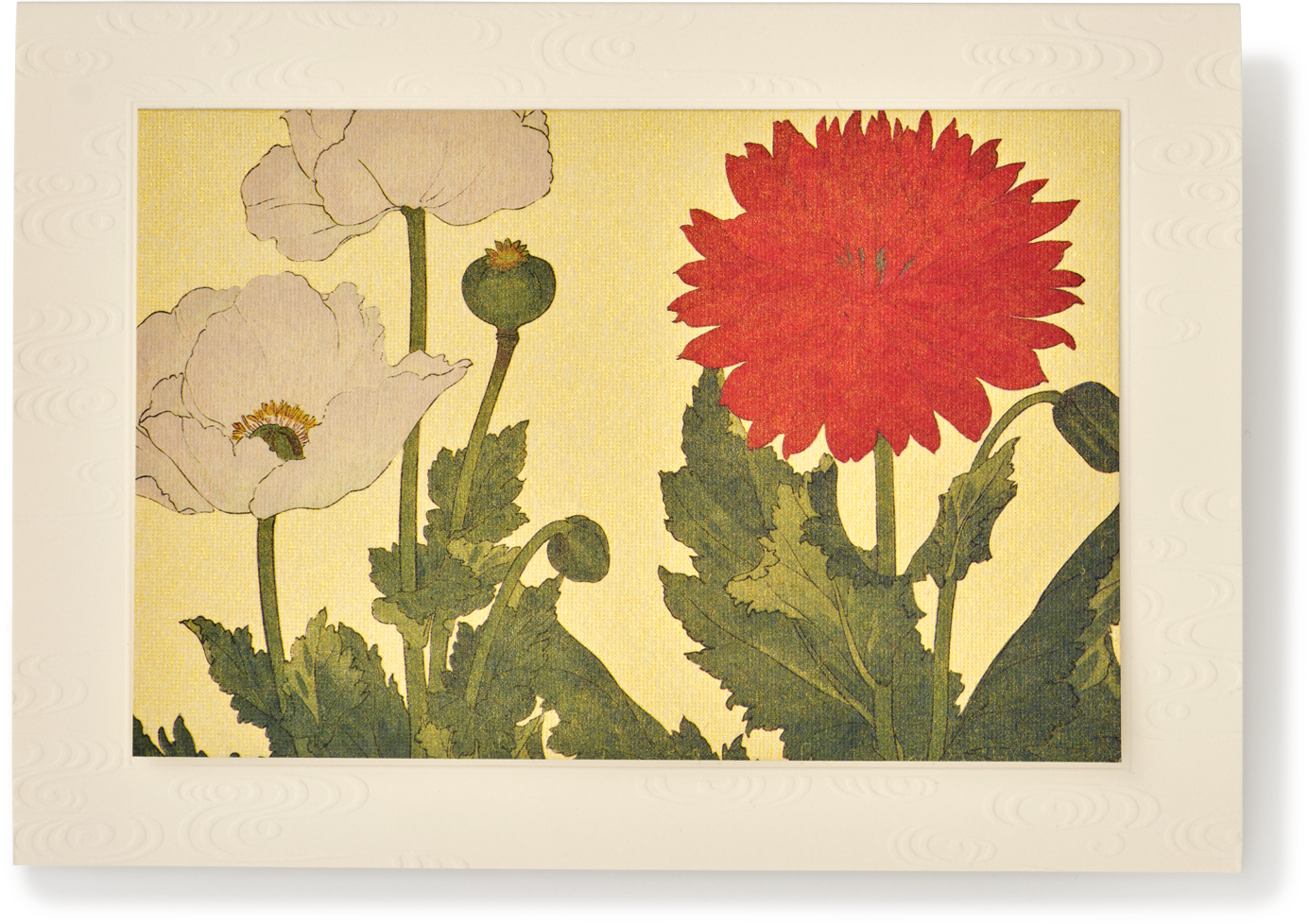 This greeting card features a sparkling illustration of poppy flowers set back against a blind embossed cream card. This type of woodblock printing makes for a very attractive matte and metallic finish, not unlike Japanese chiyogami papers.
