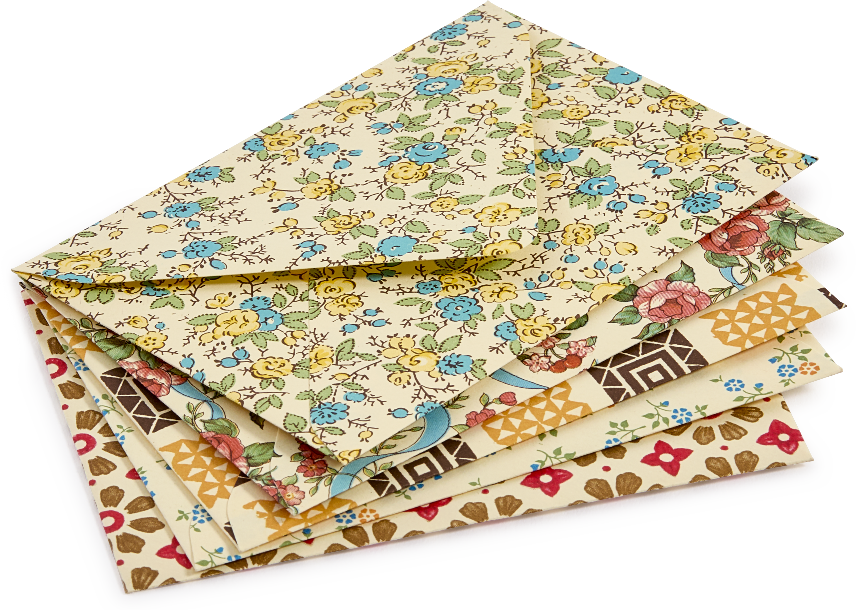 This set contains 10 mini gummed envelopes. Each envelope is cut from a different part of the pattern and so each envelope is not necessarily identical adding to the fun and artistry.