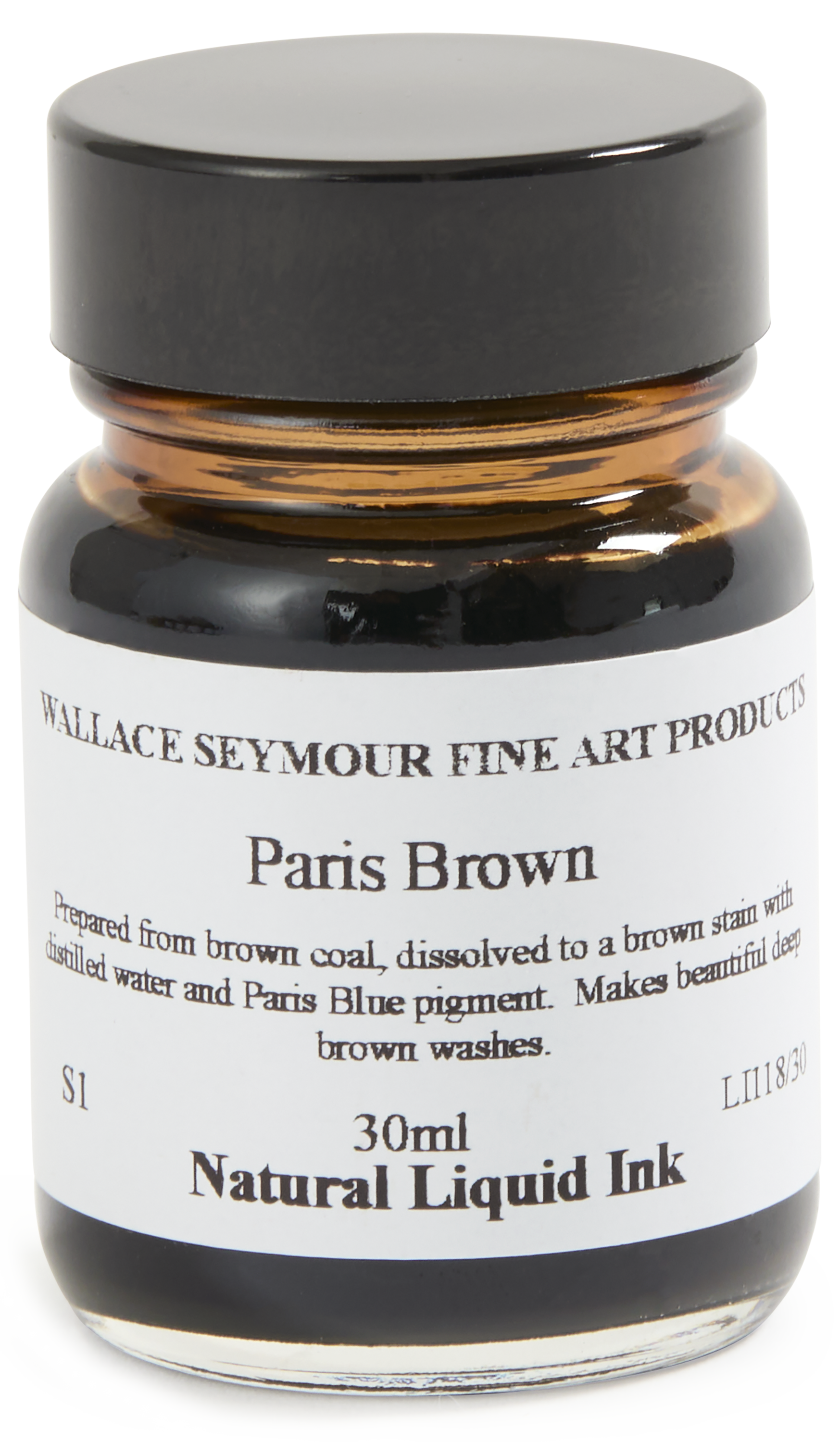 Paris Brown: Prepared from brown coal, dissolved to a brown stain with distilled water and lac dye. Makes beautiful gentle red-brown washes.