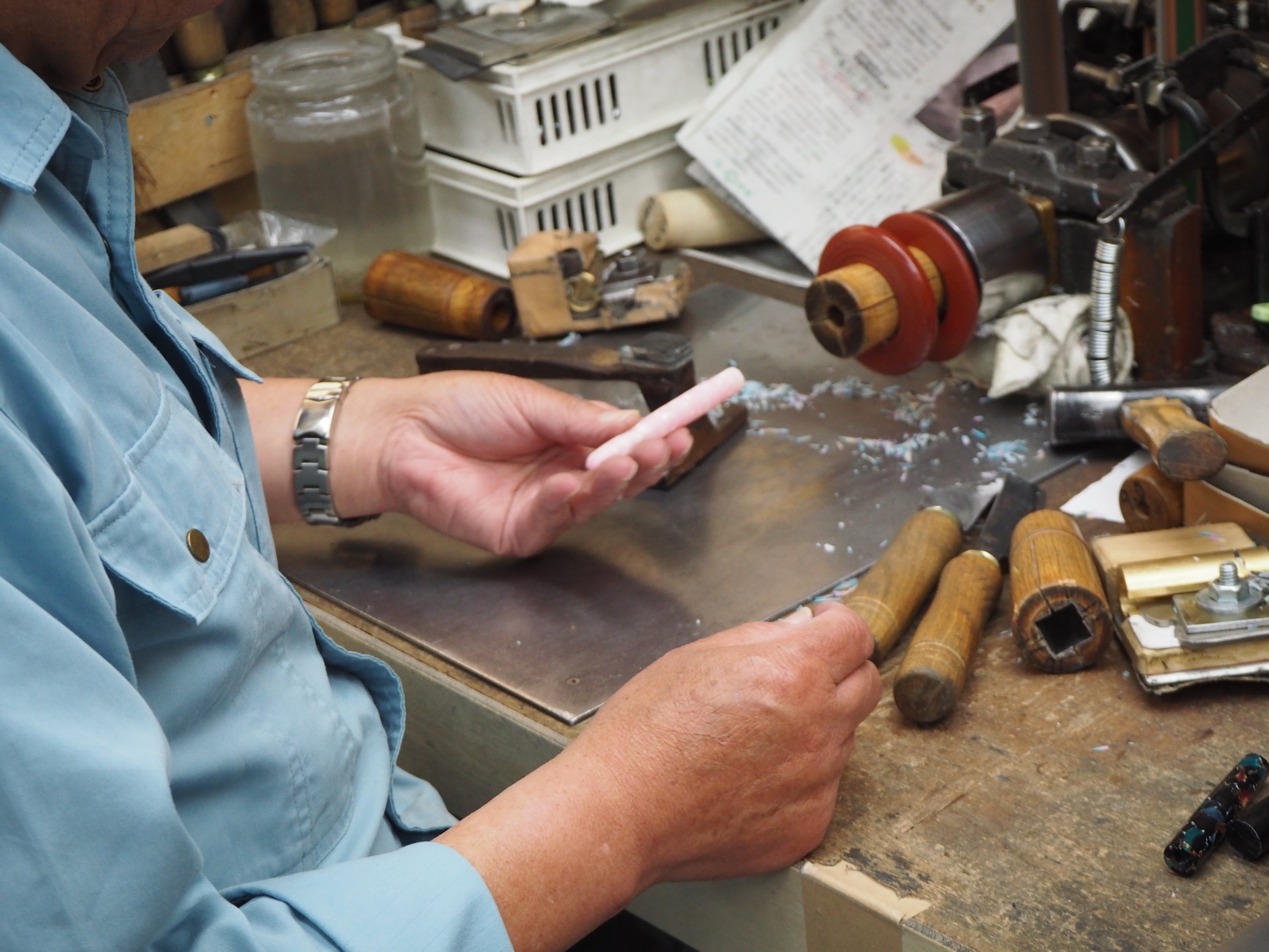 Here are the last vestiges of a once booming industry of some 500 pen makers in Osaka, producing hand-turned celluloid pens from the 1920s onwards. We feel proud to present to our customers the pens of Mr Kato and his apprentice Mr Ohnishi, who have been safekeeping this craft single-handedly for the last few decades.