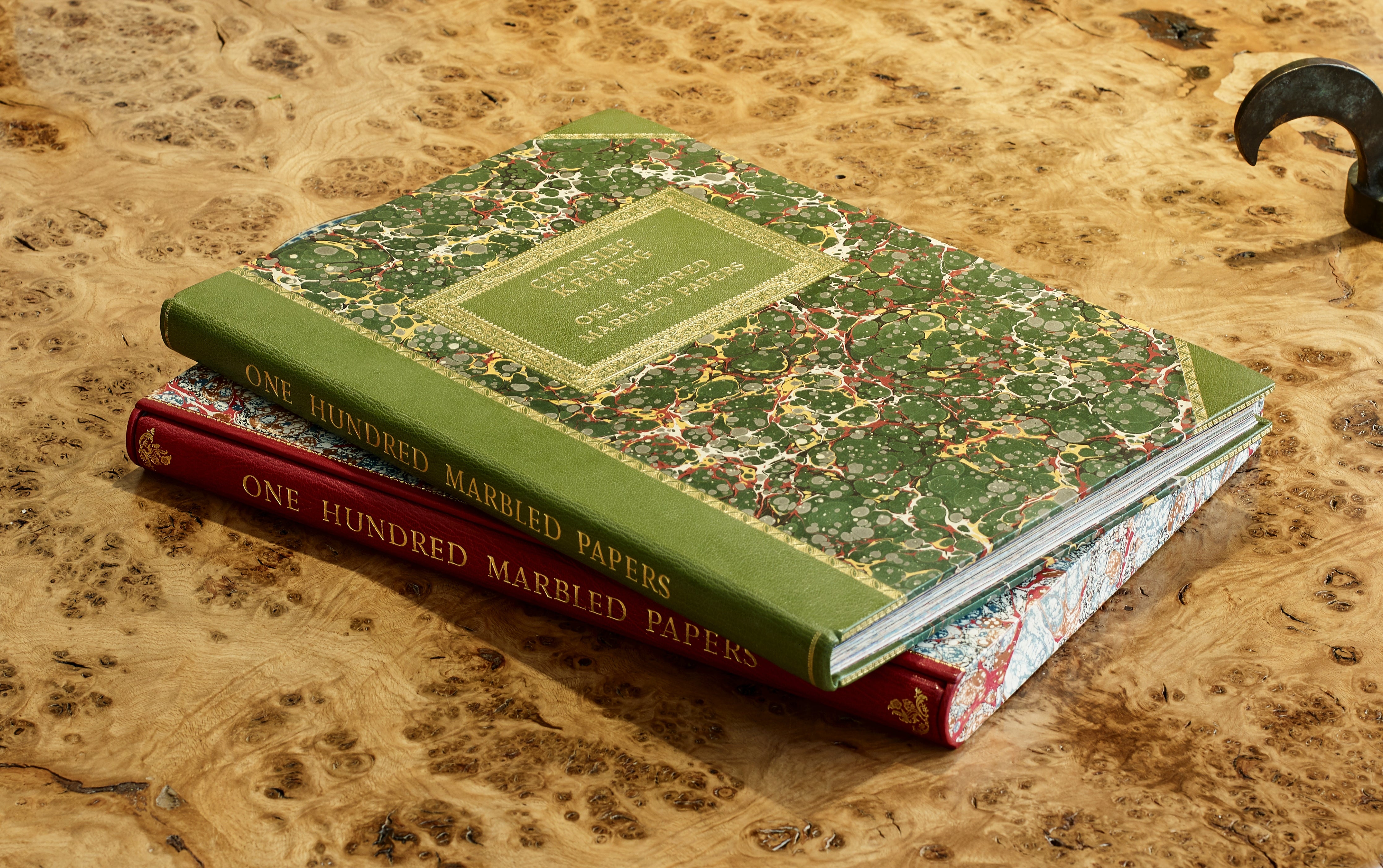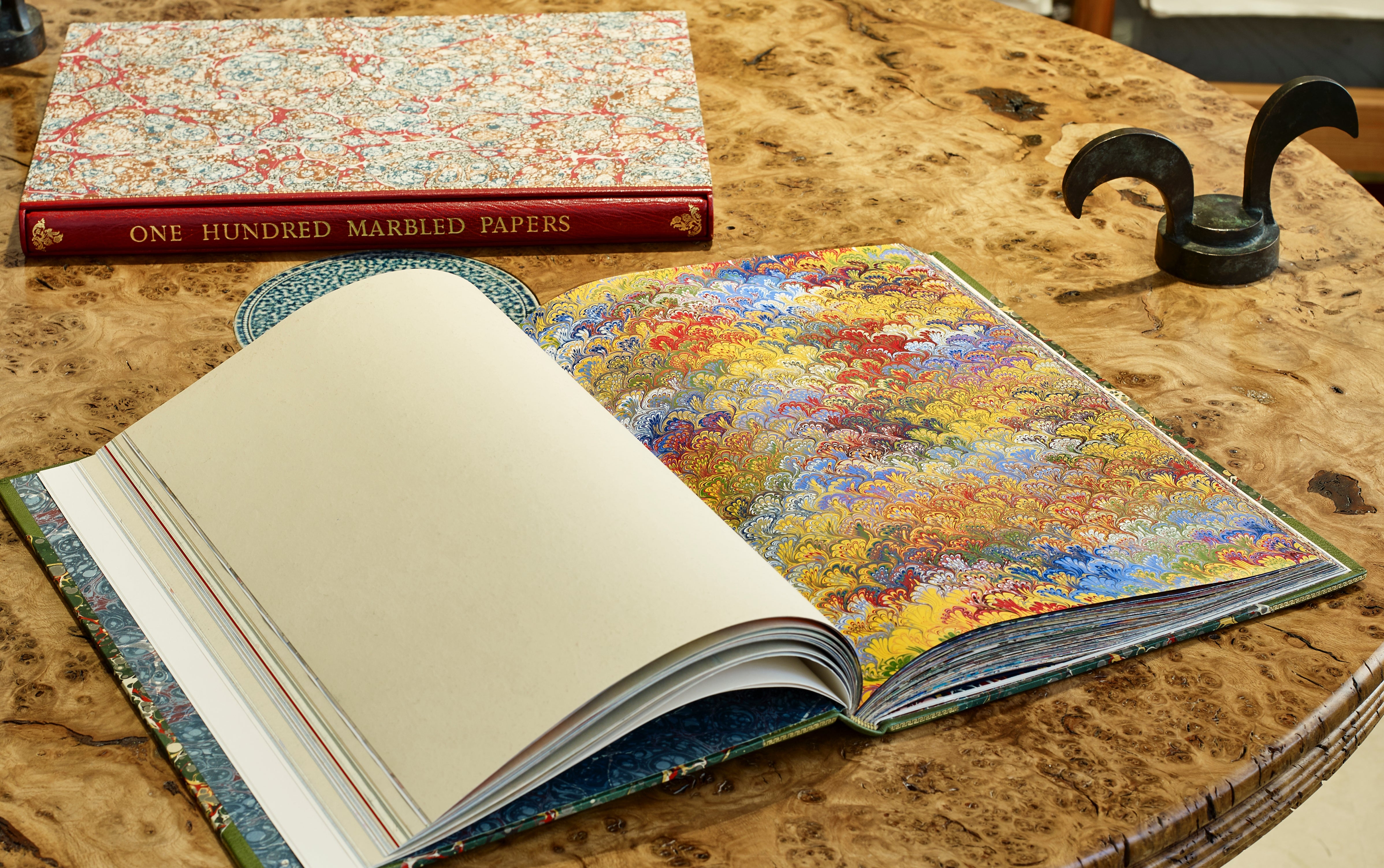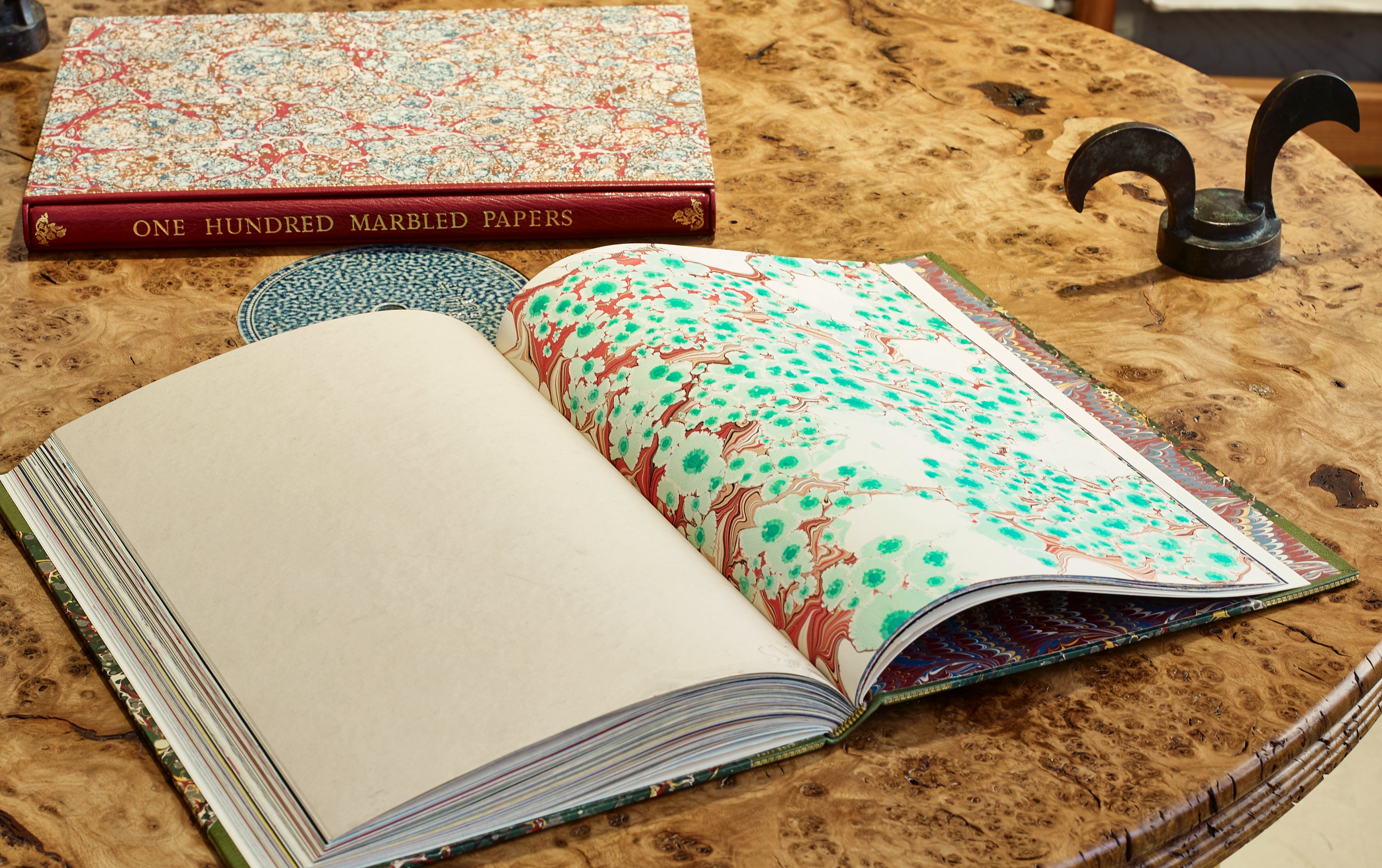 Presenting here a rare and finely bound volume presenting 100 original sheets of marbled paper from leading international contemporary paper marblers. Many sheets are sold to museums for their Decorative Arts collections. This volume was produced in an effort to assemble, conserve and highlight the work of artists, who's fleeting production is rarely exhaustively archived, existing in a segmented manner across bookends and ephemera in the world libraries. Find them here assembled in an exceptionally crafted object. Something for paper and book lovers combined.