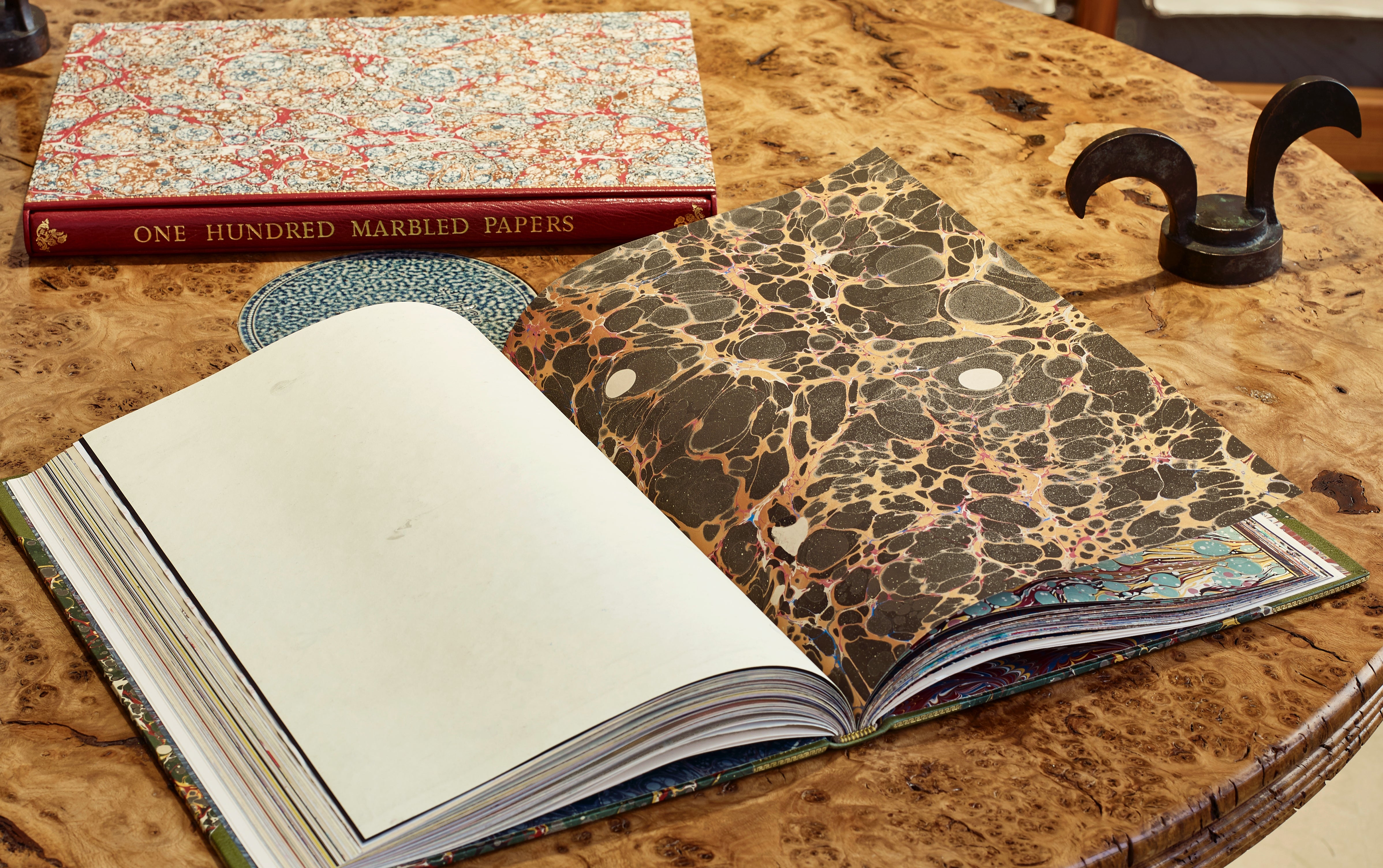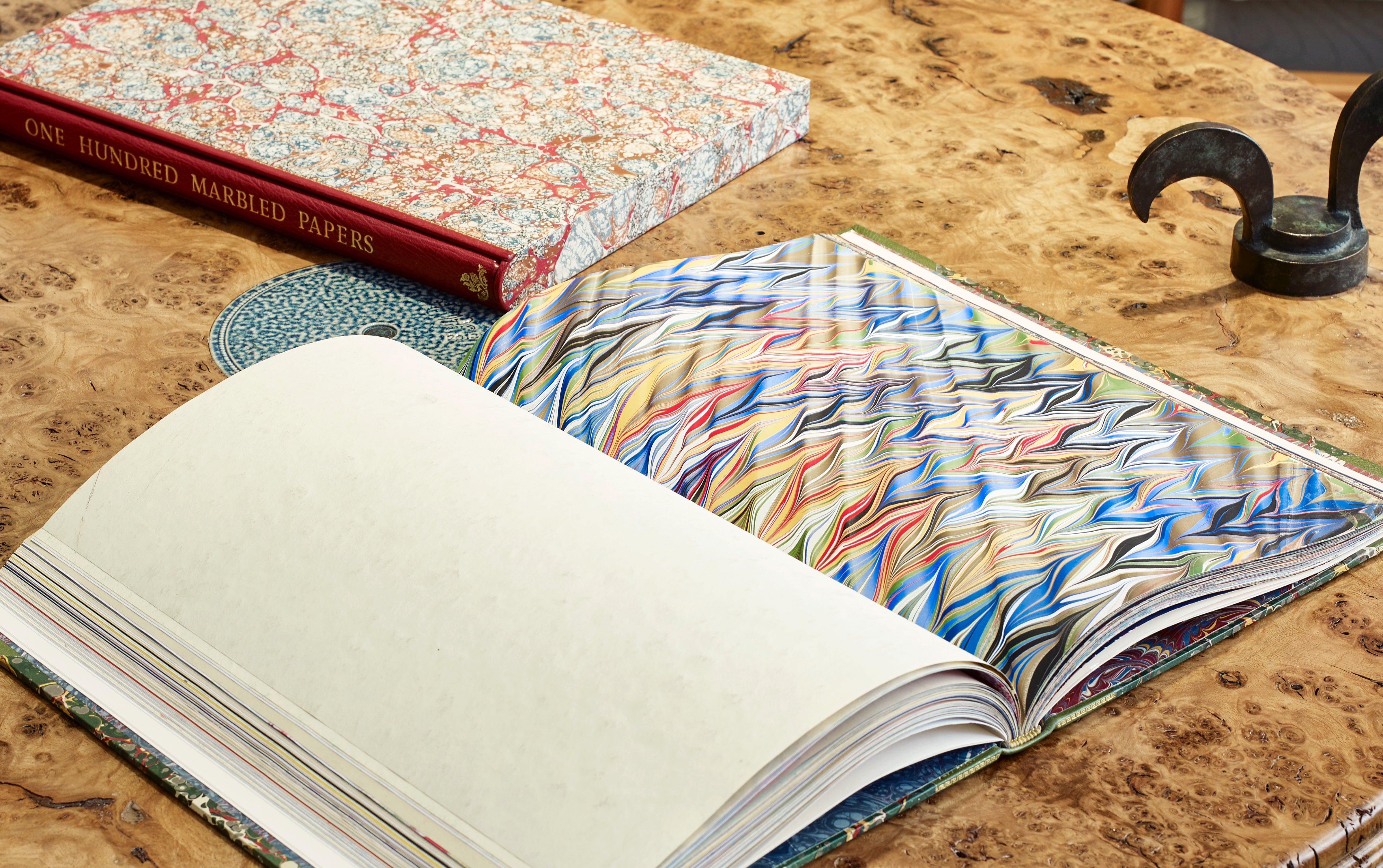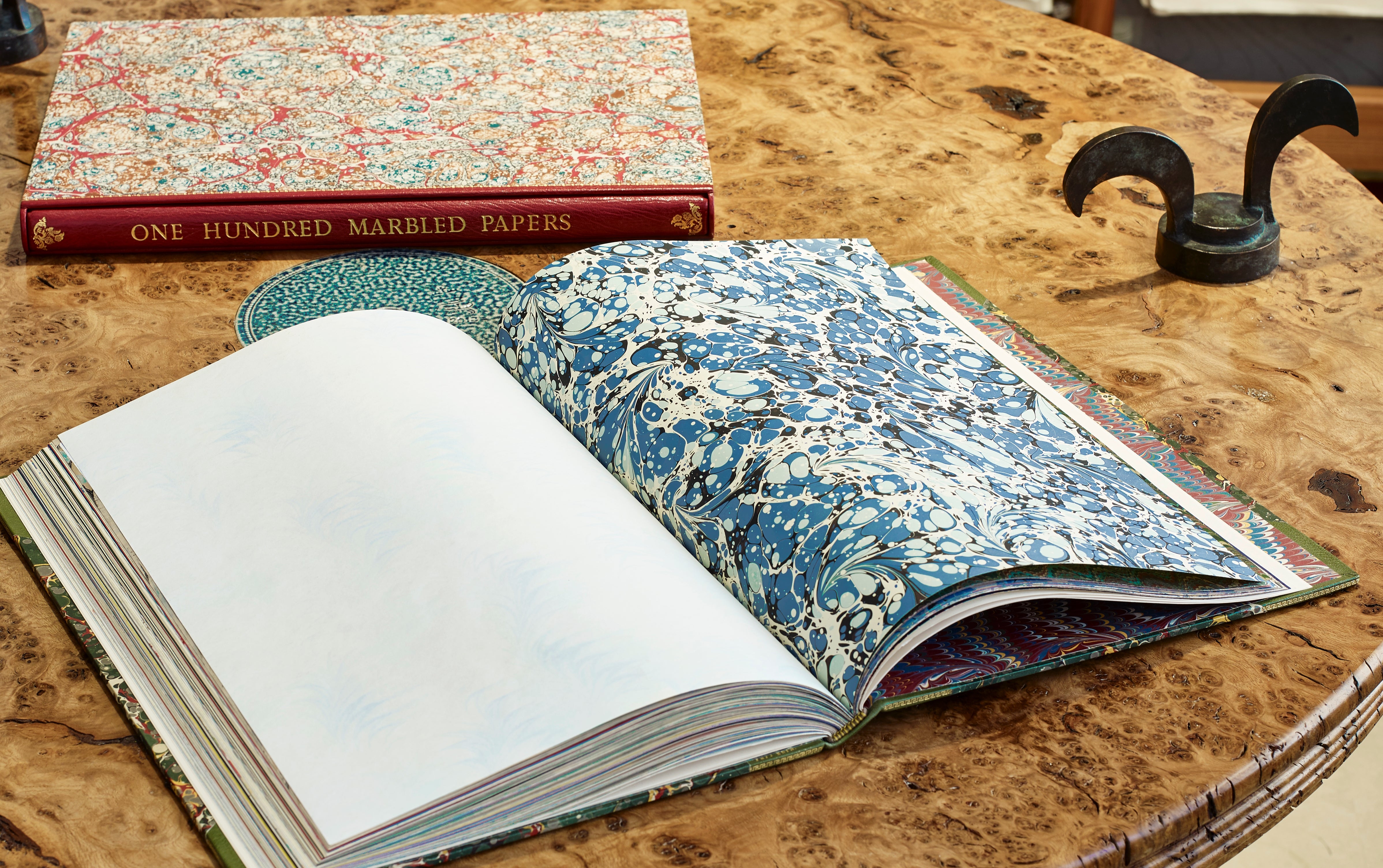 Presenting here a rare and finely bound volume presenting 100 original sheets of marbled paper from leading international contemporary paper marblers. Many sheets are sold to museums for their Decorative Arts collections. This volume was produced in an effort to assemble, conserve and highlight the work of artists, who's fleeting production is rarely exhaustively archived, existing in a segmented manner across bookends and ephemera in the world libraries. Find them here assembled in an exceptionally crafted object. Something for paper and book lovers combined.