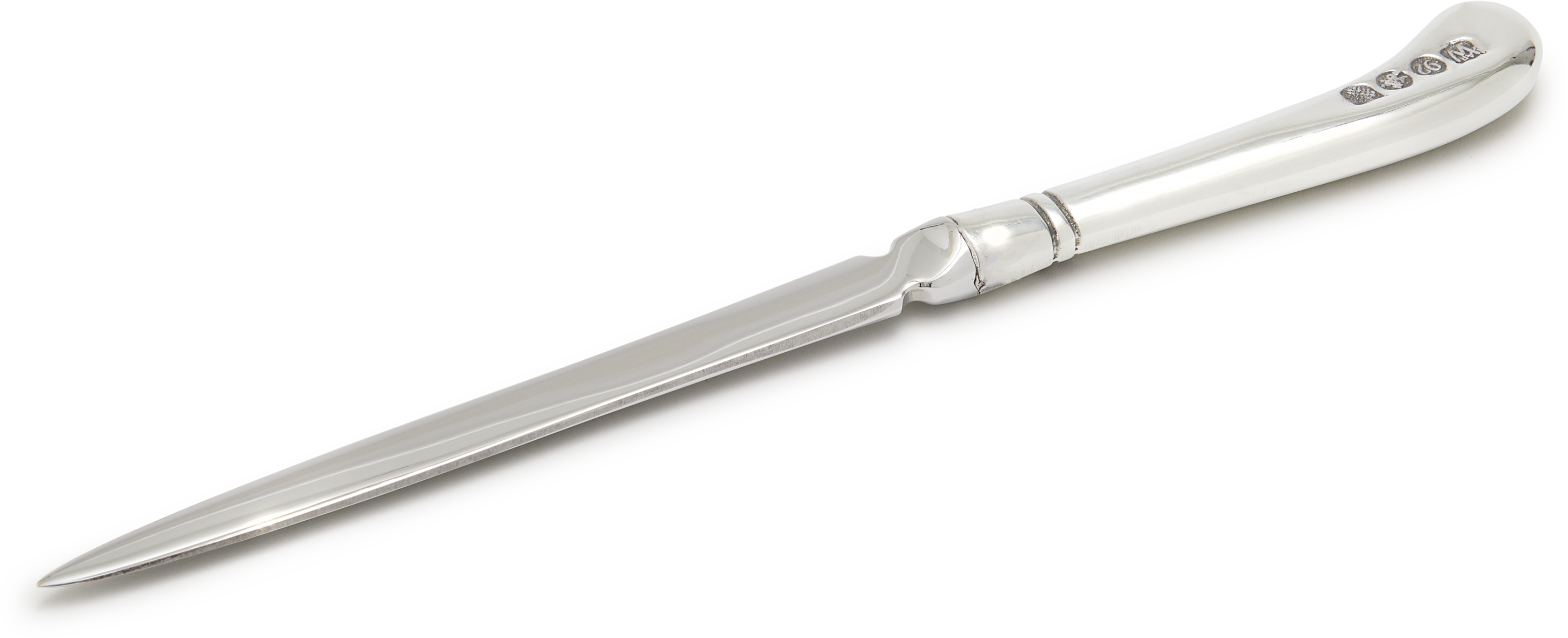 A desk piece with quiet presence, this letter opener pairs a pewter pistol-style handle with a stainless-steel blade, giving a pleasing balance in the hand. The form is drawn from 18th-century pistol grips — not as a pastiche, but as a nod to the shaping and metalwork traditions from which modern Sheffield pewter evolved.