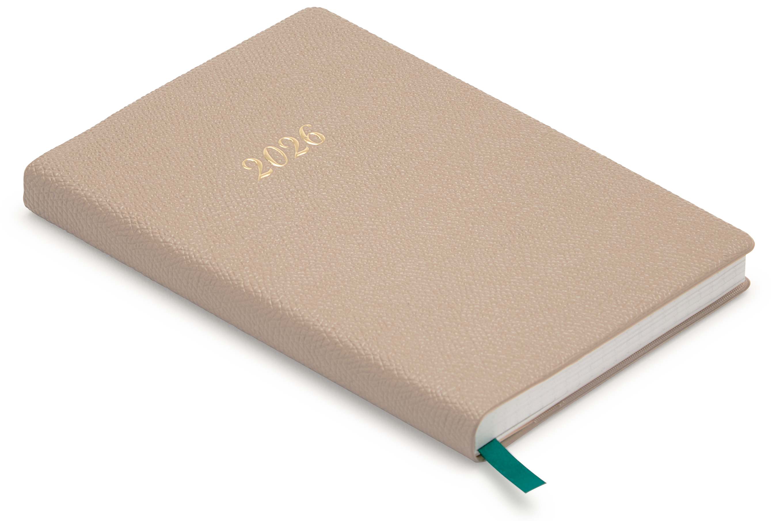 This Delfonics 2026 diary features a textured beige cover with a gold-stamped year and a contrasting green ribbon marker. Inside, the weekly layout spans two pages, giving each day a clear quarter-page for appointments and notes, supported by additional pages at the back for general planning. Made in Japan and designed in Tokyo, it reflects Delfonics’ long-standing focus on thoughtful layouts, high-quality materials and understated, functional design.