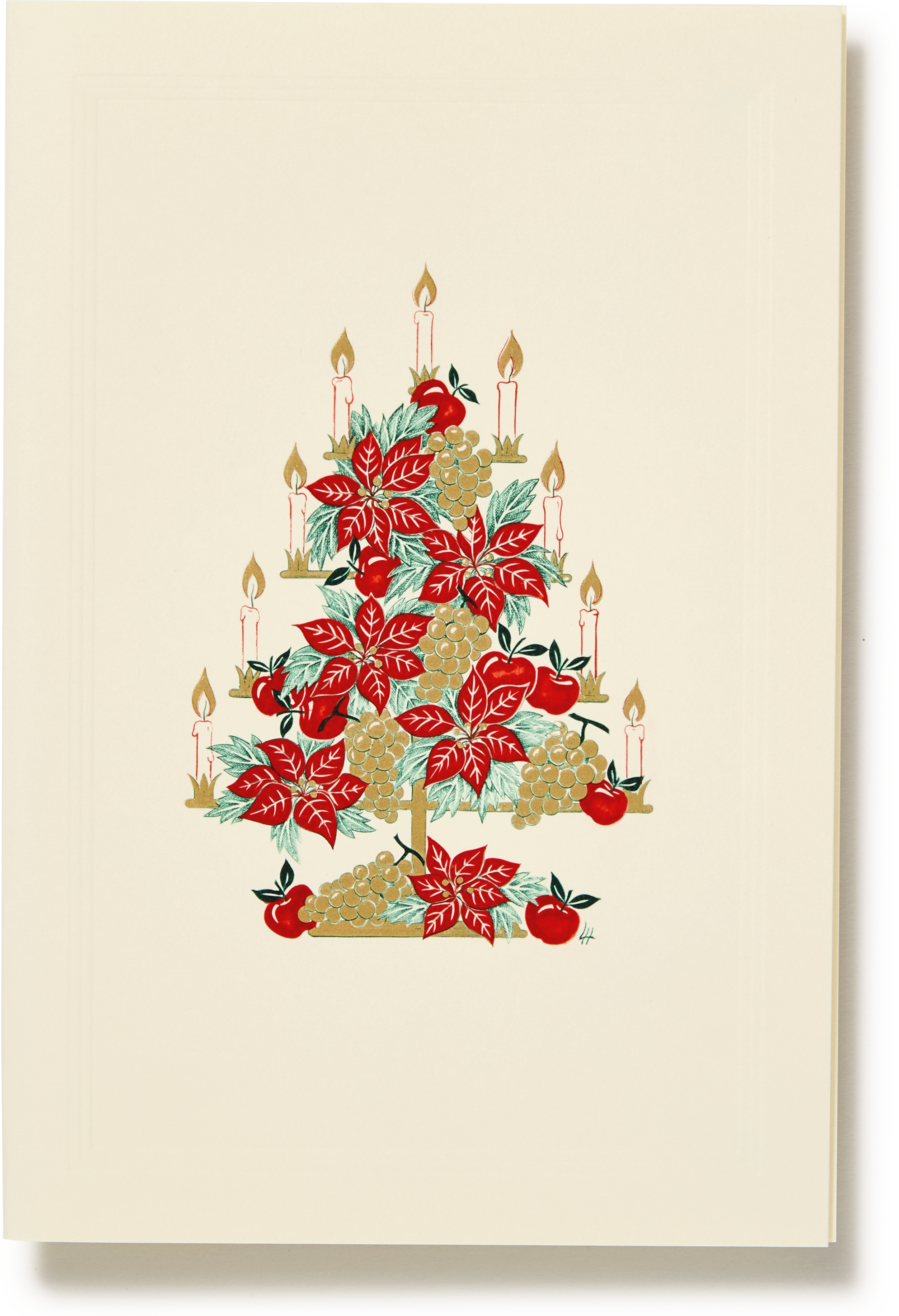A luxurious cornucopia of golden grapes, red poinsettias, shiny apples and candles. Letterpress printed with gold foil highlights.