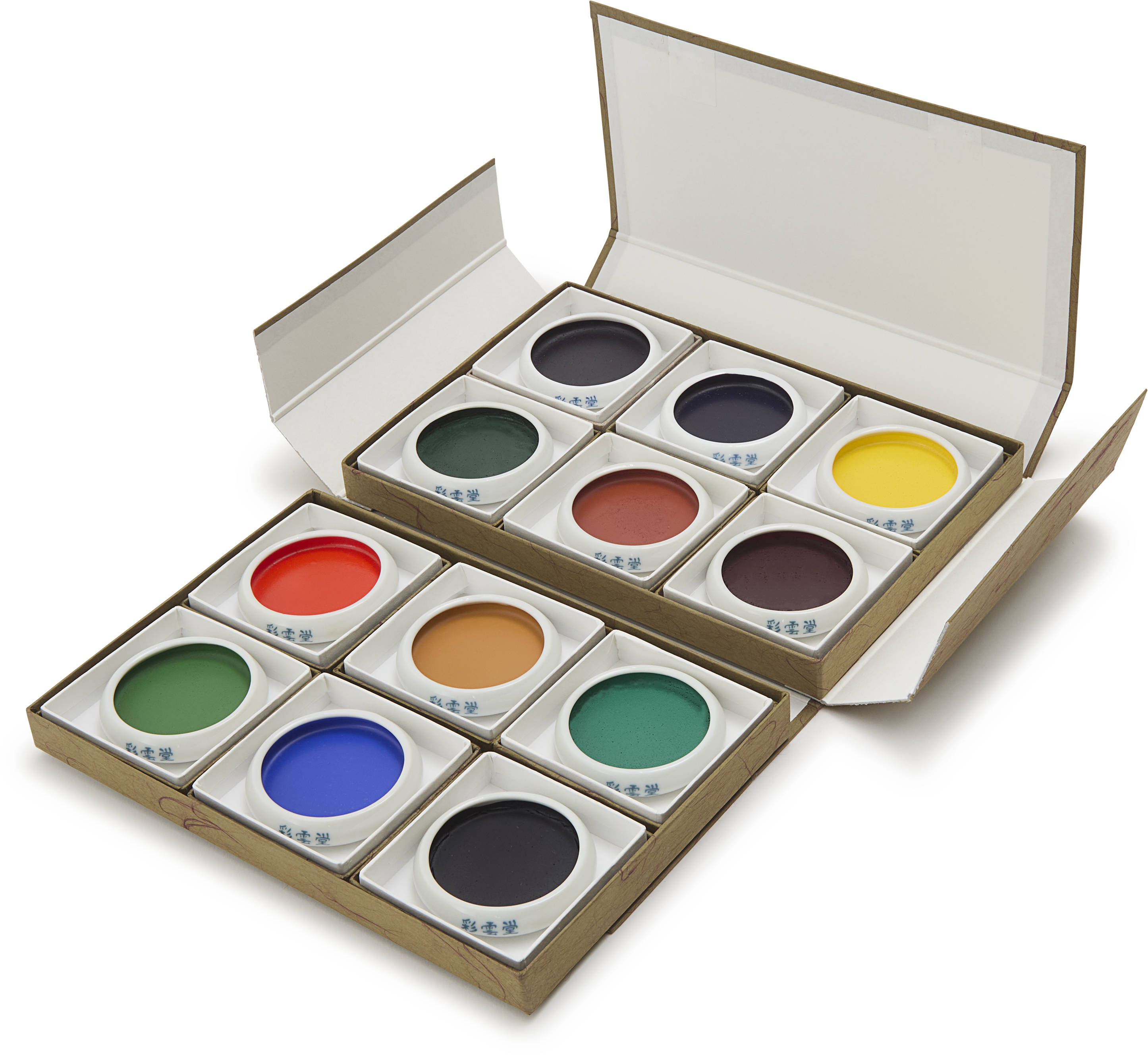 Possibly one of the most refined and sophisticatedly packaged items we have had the honour to sell, this Teppachi set contains 12 large sized watercolour pans each hand poured in individual ceramic bowls and wash covered boxes, and arranged over two layers and then bound like a folder-like satchel - pure Japanese packaging joy.