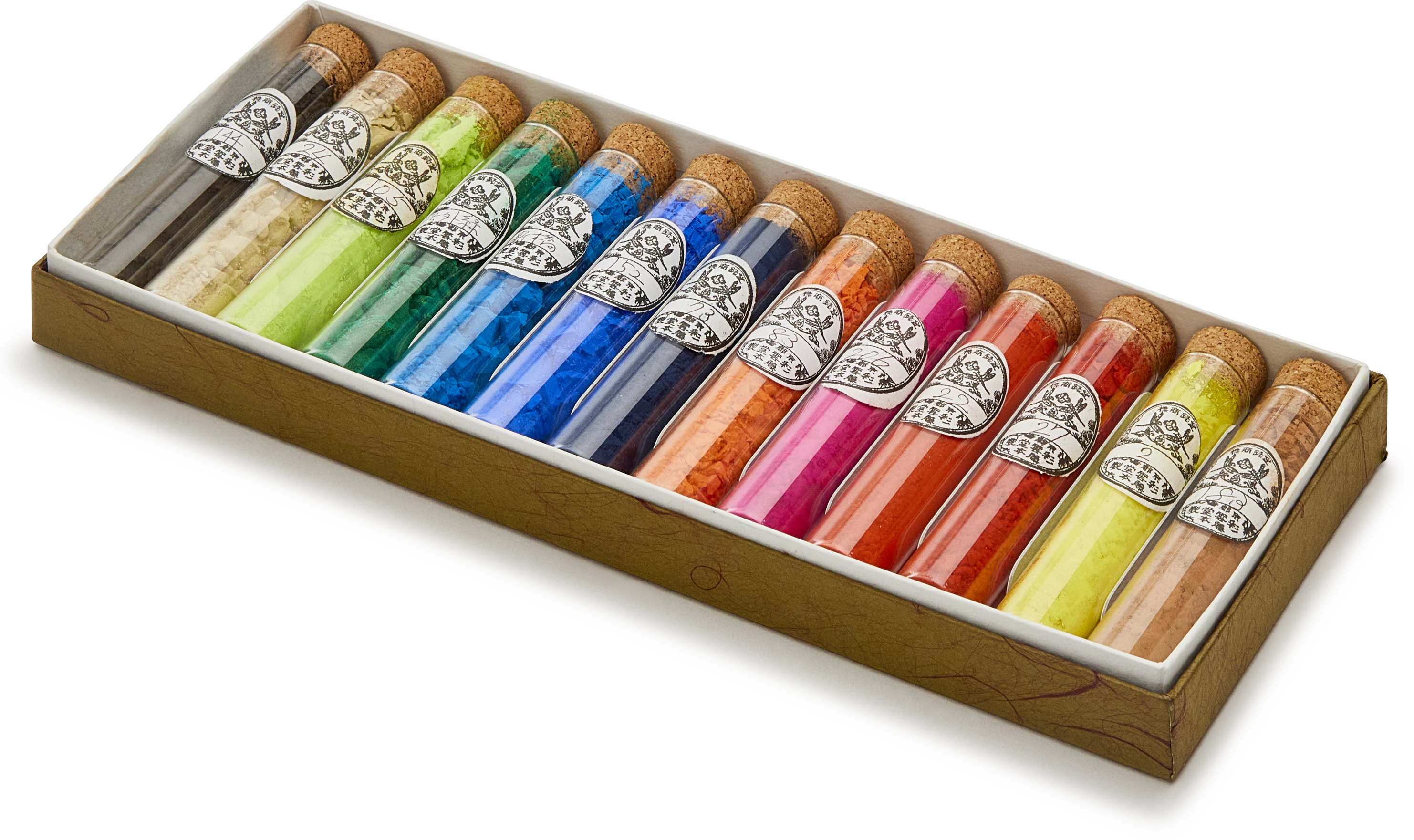 Each set contains 13 colours, packaged and labelled individually in corked glass vials, in turn wrapped and presented in a delicate Japanese washi-paper box and shop wrapping paper.