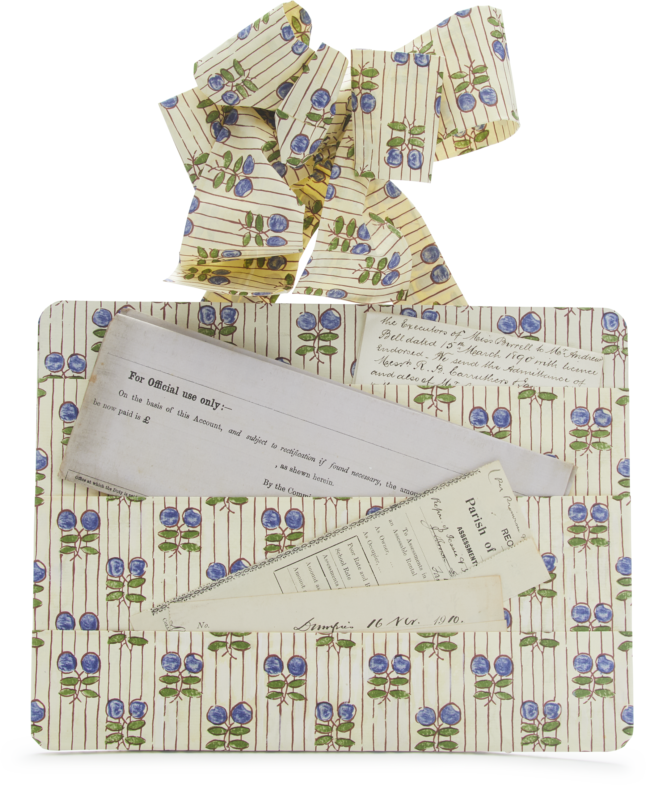 This handmade memo board, covered in an Italian offset-printed paper, has several pockets to allow for displaying letters, photographs, and mementos, and is luxuriously adorned with a sculpted paper bow to hang it from.