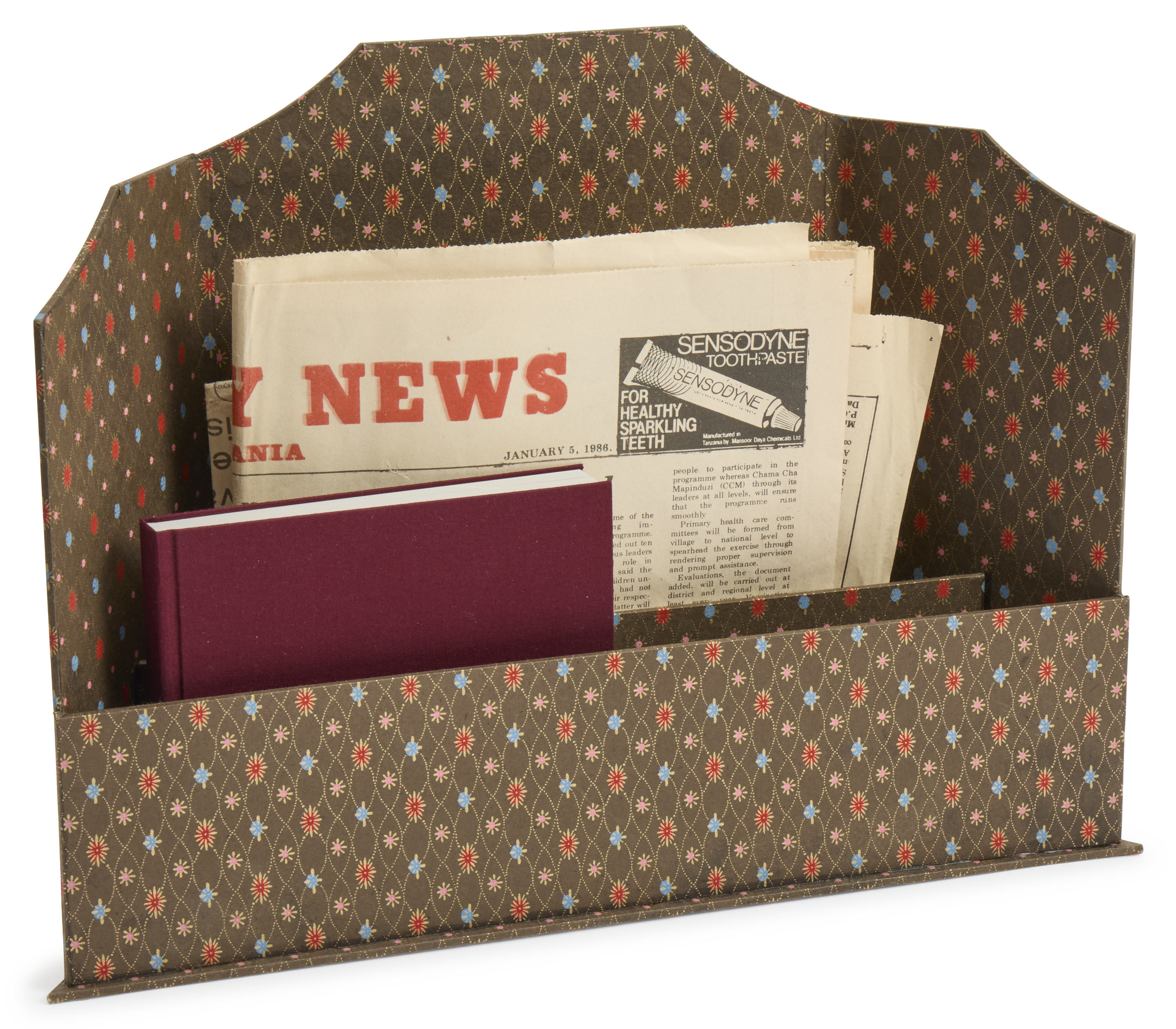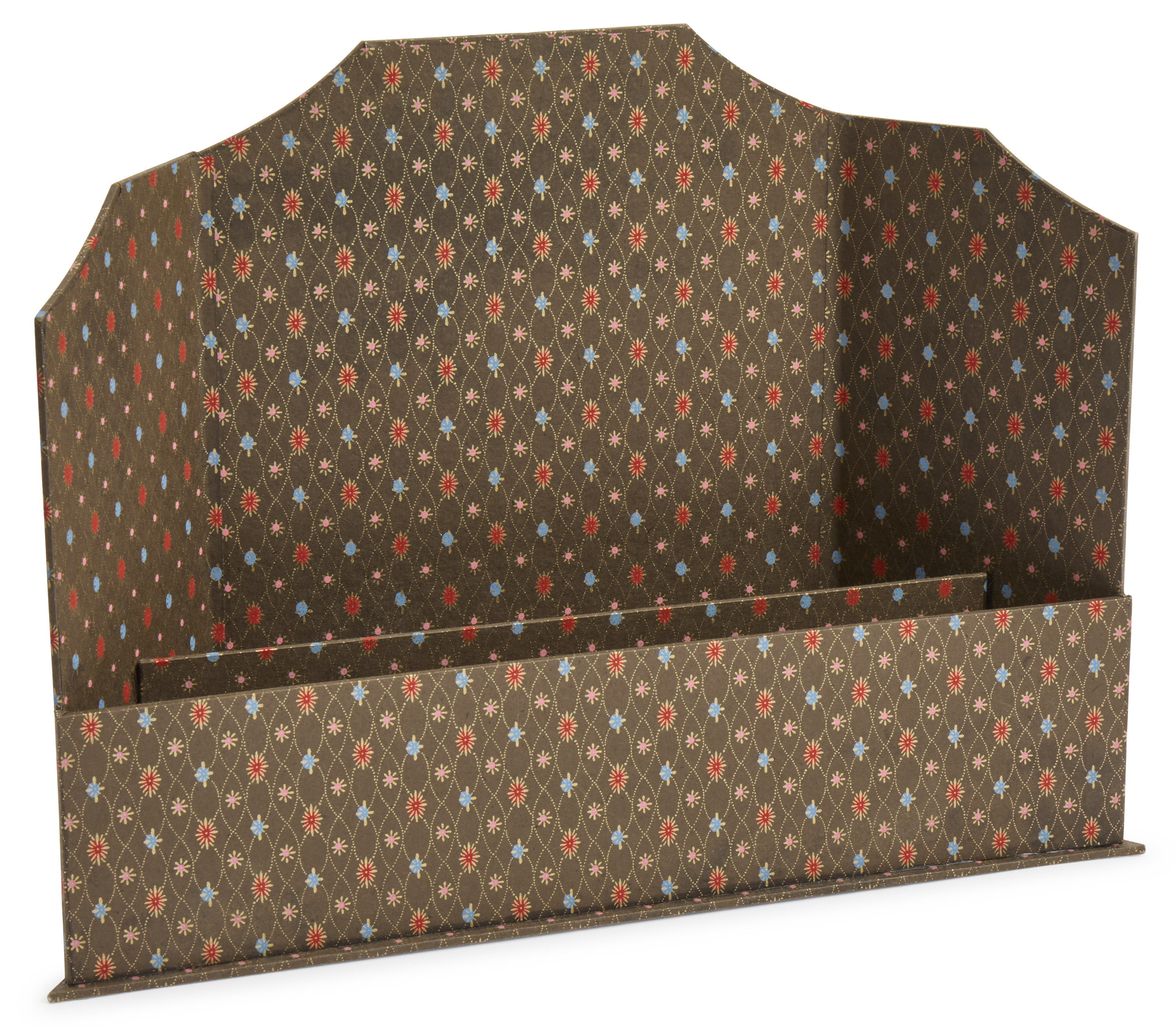This triptych letter holder, covered in a Japanese chiyogami silkscreen paper, is a generous receptacle for letters, greeting cards, and any other paper ephemera your desk may collect.