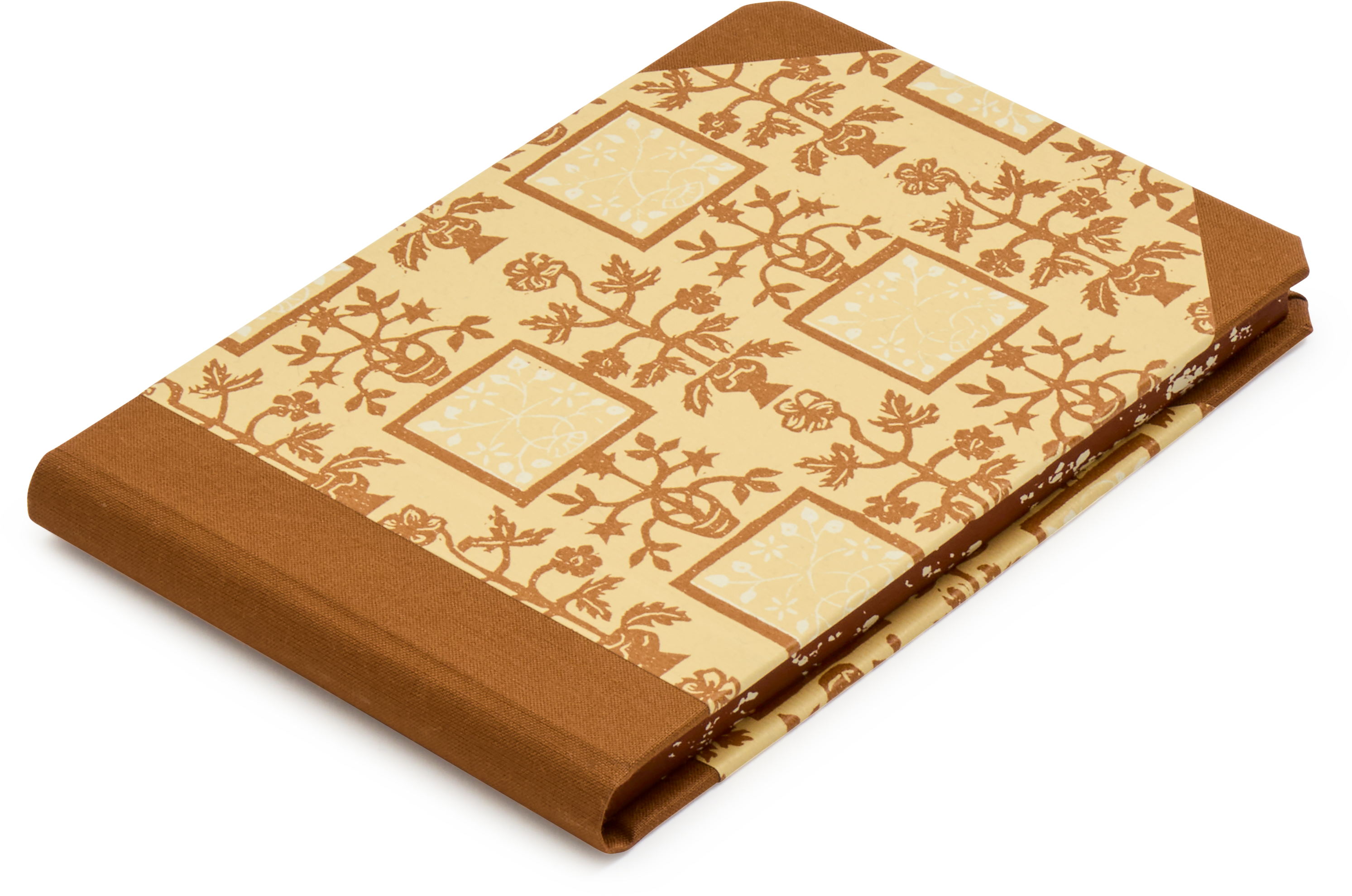 The paper covering this book is a woodblock print, reproducing regional Italian motifs from this sixth-generation printers’ company archive.