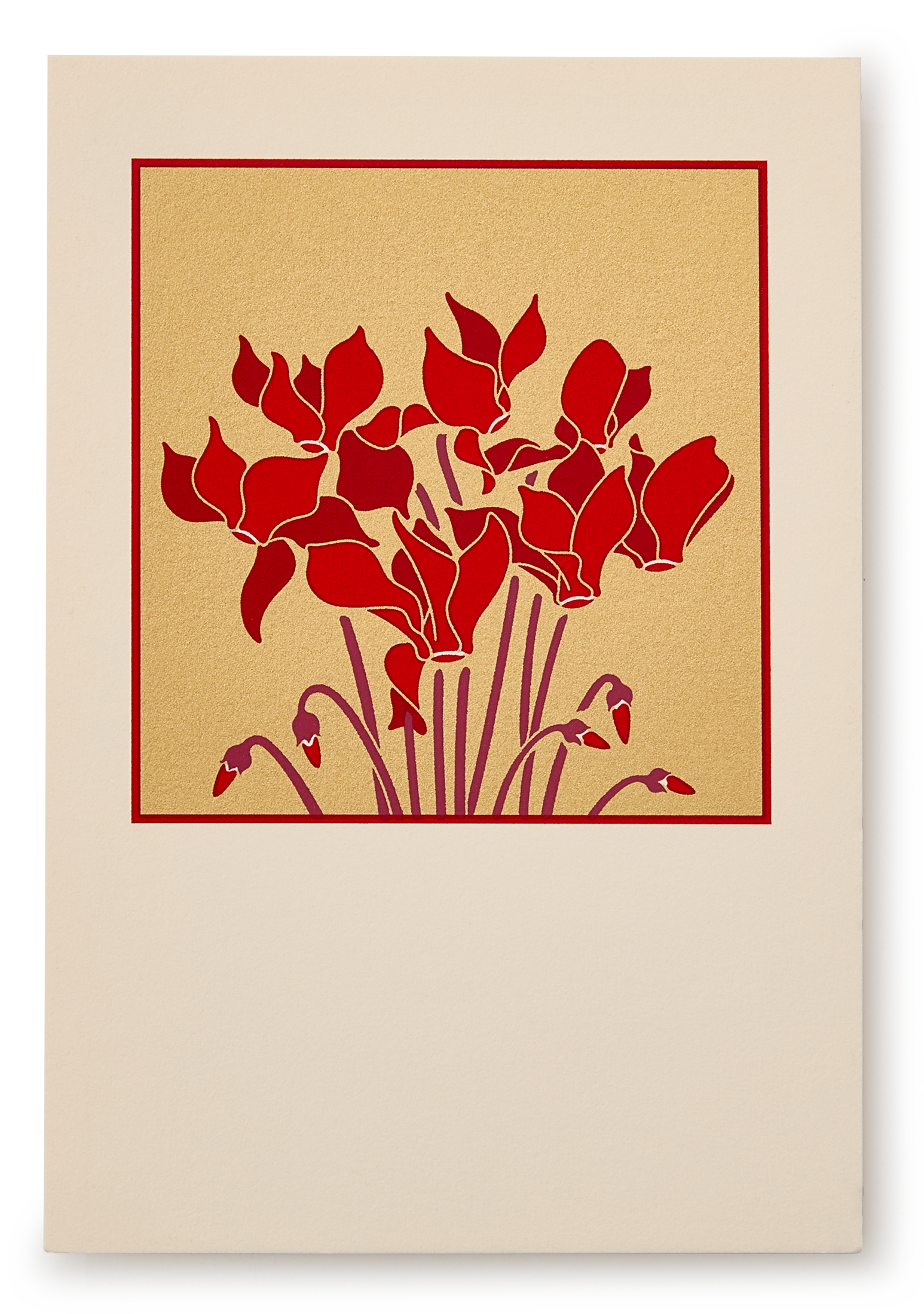 Here depicted, the cyclamen, long cultivated in Europe since the 18th century, became a popular winter flower in the 19th and early 20th centuries, blooming naturally through the cold months when little else did: a symbol of warmth, endurance, and affection in the darker season.
