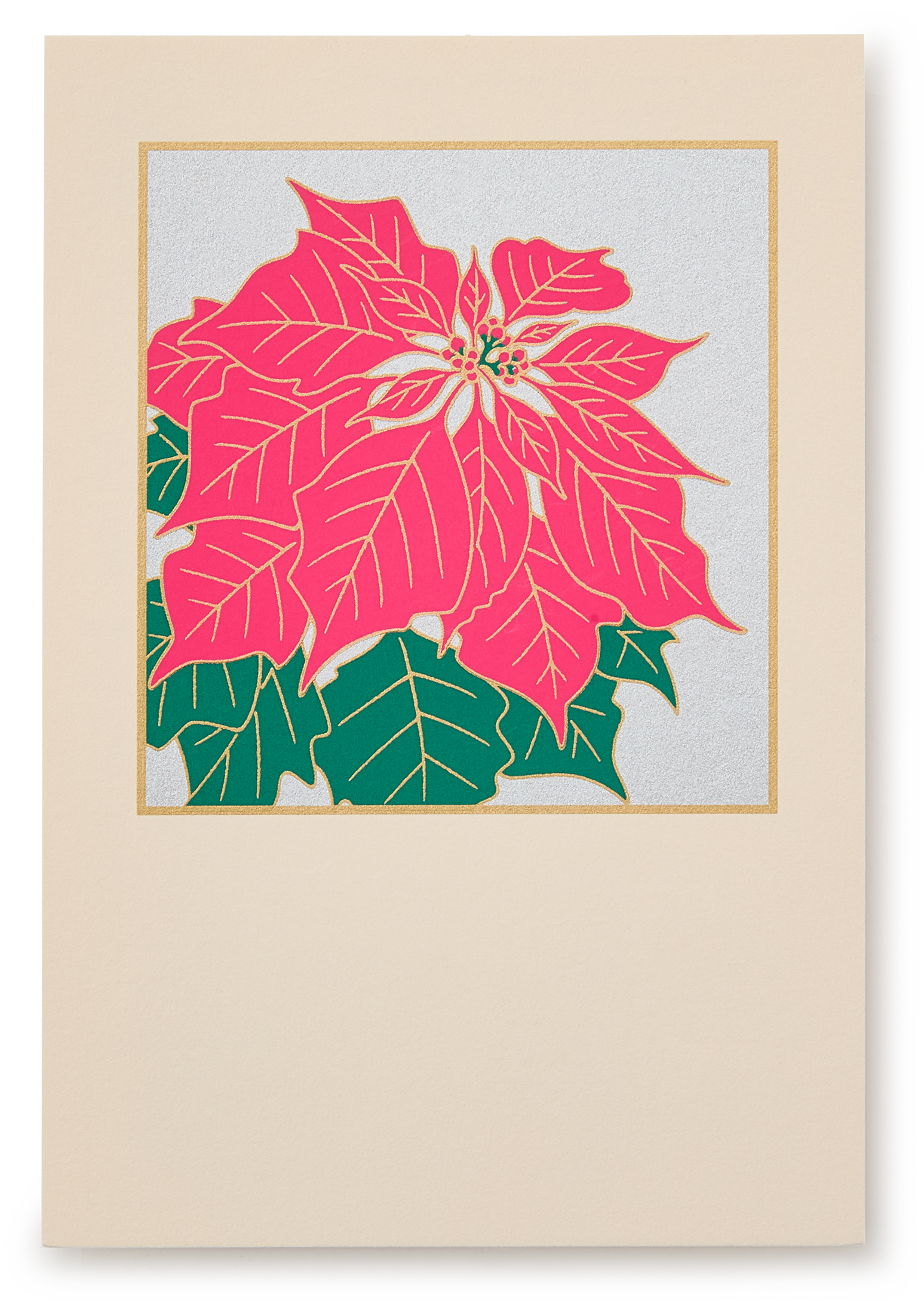 The poinsettia is not native to Japan, but it entered Japanese decorative life in the Taishō and early Shōwa periods (1910s–1930s), when Western customs and motifs were enthusiastically adopted in print and design. Its geometric form and brilliant red bracts suited the developing modern aesthetic, and by the post-war years it had become a familiar sight in Christmas shop displays and seasonal paper goods.