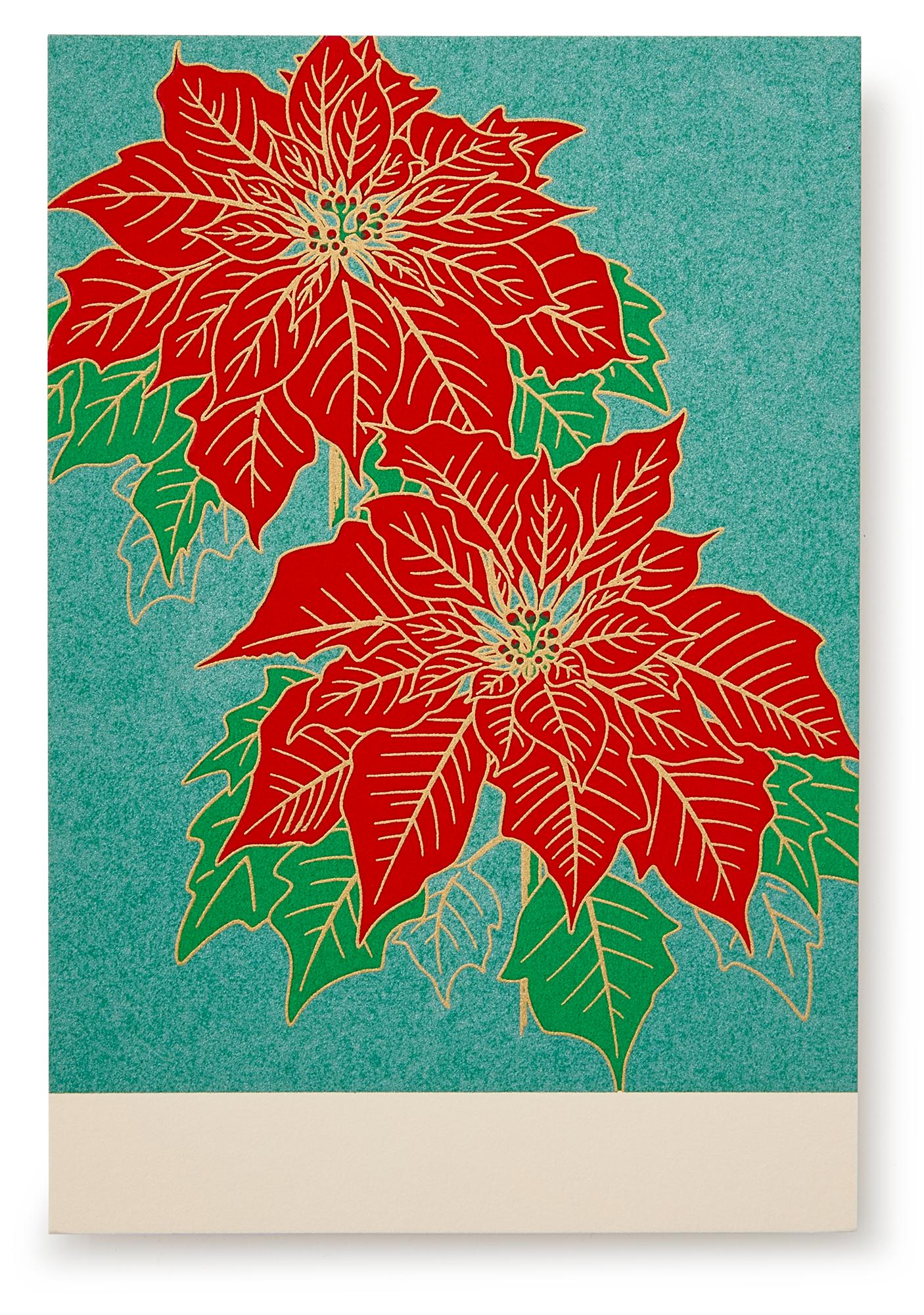 The poinsettia is not native to Japan, but it entered Japanese decorative life in the Taishō and early Shōwa periods (1910s–1930s), when Western customs and motifs were enthusiastically adopted in print and design. Its geometric form and brilliant red bracts suited the developing modern aesthetic, and by the post-war years it had become a familiar sight in Christmas shop displays and seasonal paper goods.