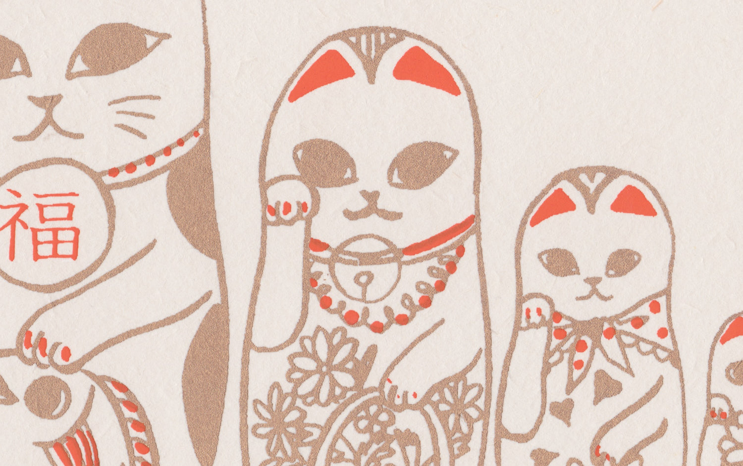 The maneki-neko, literally beckoning cat, is a common Japanese character who is thought to bring good luck to its owner. Said to attract different kinds of luck depending on which paw is raised - the right paw, as depicted here, brings wealth whilst the left is said to bring customers.