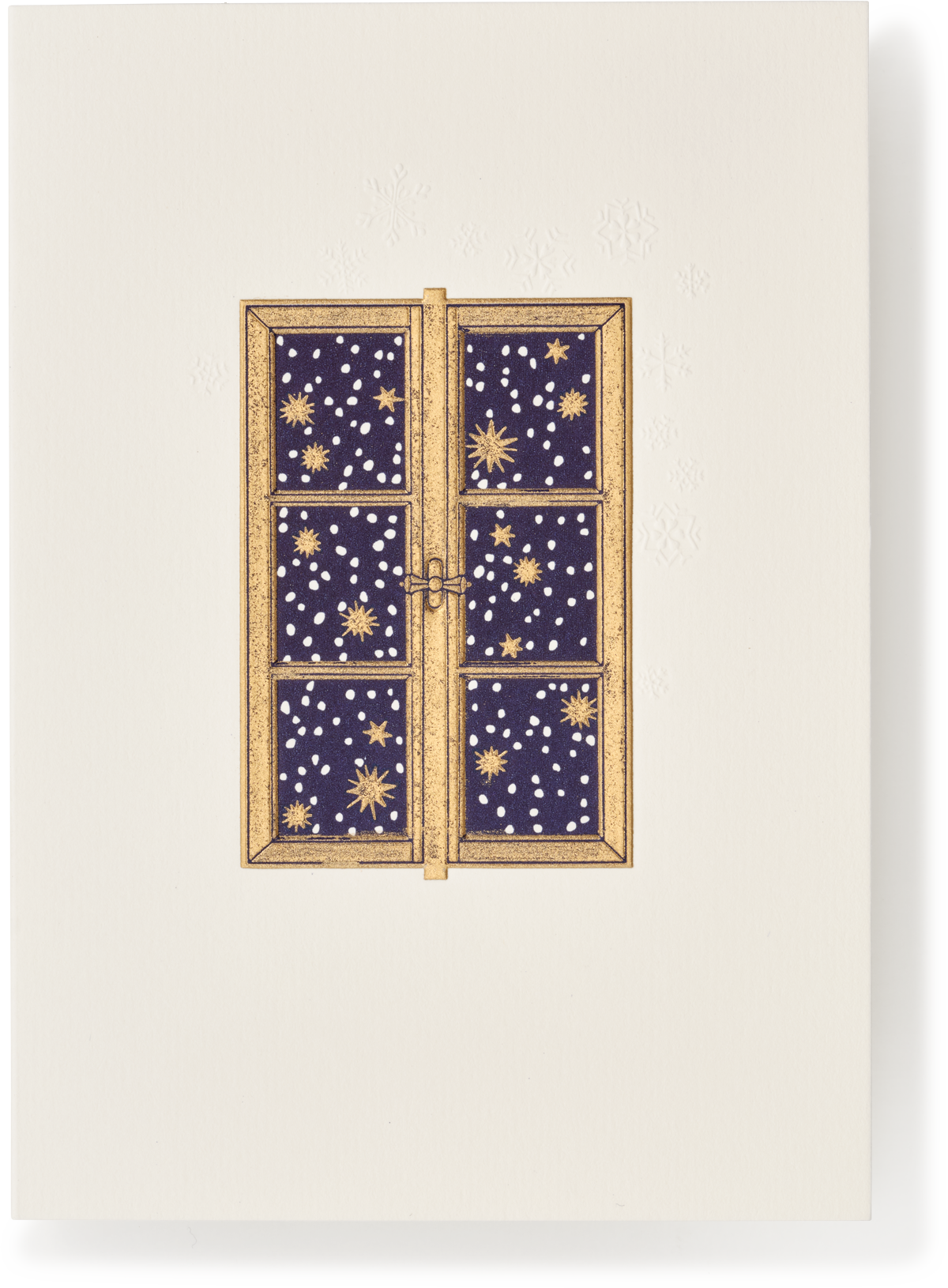 Here presented, a very proper, traditionally hand engraved card, using copperplate printing with gold highlights. Unfortunately difficult to capture on camera - this design also features blind embossed snow flakes around the window and a gold tissue-lined envelope