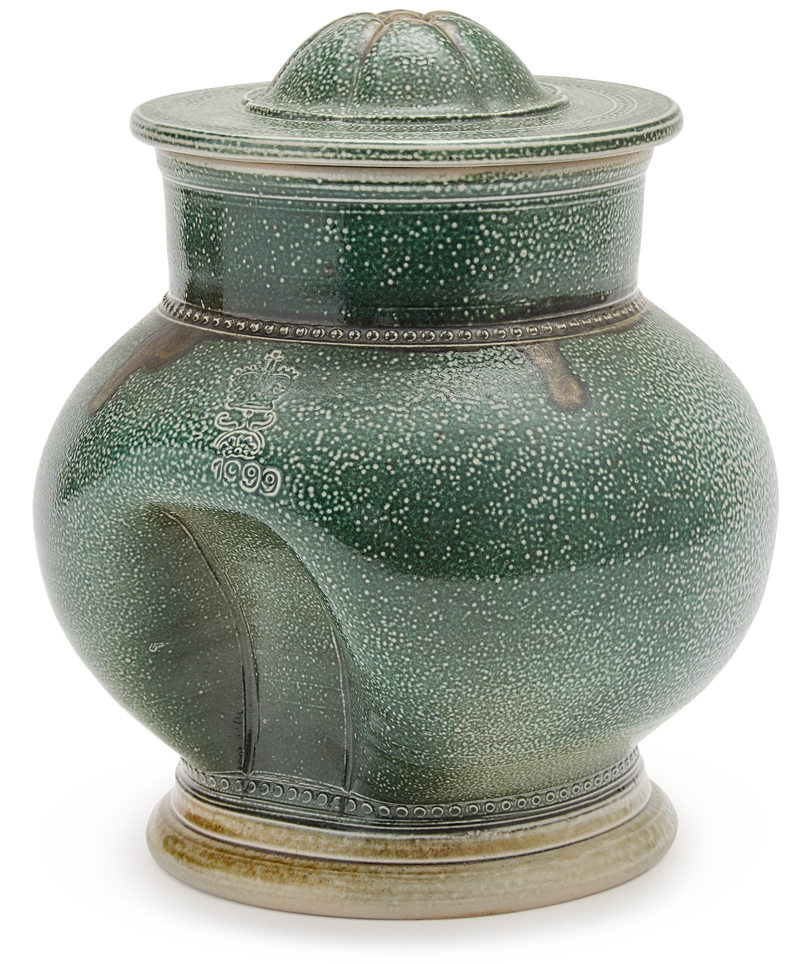 In its long-standing infatuation with polymath potter Steve Harrison, Choosing Keeping is pleased to offer a small selection of historical pieces which offer an insight into the artist's beginnings and re-imaginations. Working through different kilns, clay types and finishes, each rendering unique idiosyncrasies, Steve's early work is often starker and closer to the British studio pottery rugged aesthetic. Mid-career pieces offer development into historical and sometimes more feminine forms. Later pieces straddle the field of fine art, obsessive with experimentation and pushing boundaries. All have in common the vigour and passion of the artist. This spectacular and large jar, from 1999 features Steve's classic rich and gregarious green colour, elegant lotus shaped lid and more robust and confident 'bashed' dent - an idiosyncratic and deliberate studio pottery effect to give the pot character and more importantly a 'front' side.