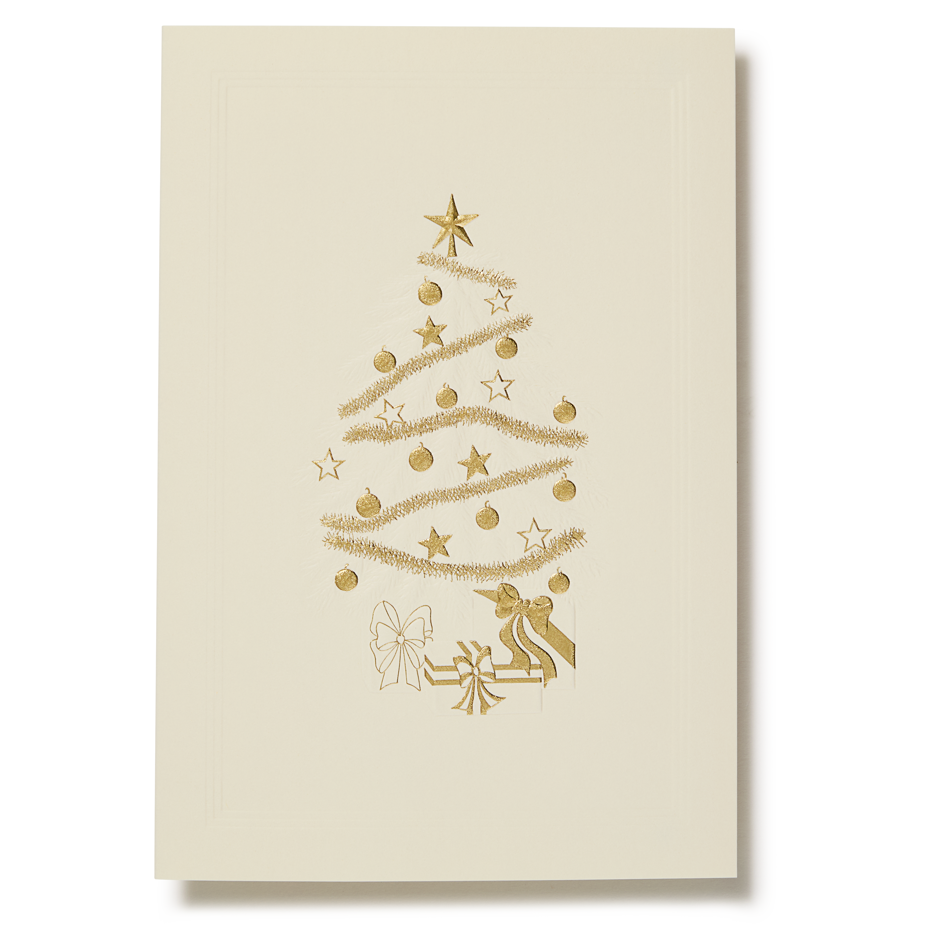 The traditional iconography of Christmas is here revisited with gold foiled tinsel and baubles against a blind embossed tree. A universal message of festive cheer.