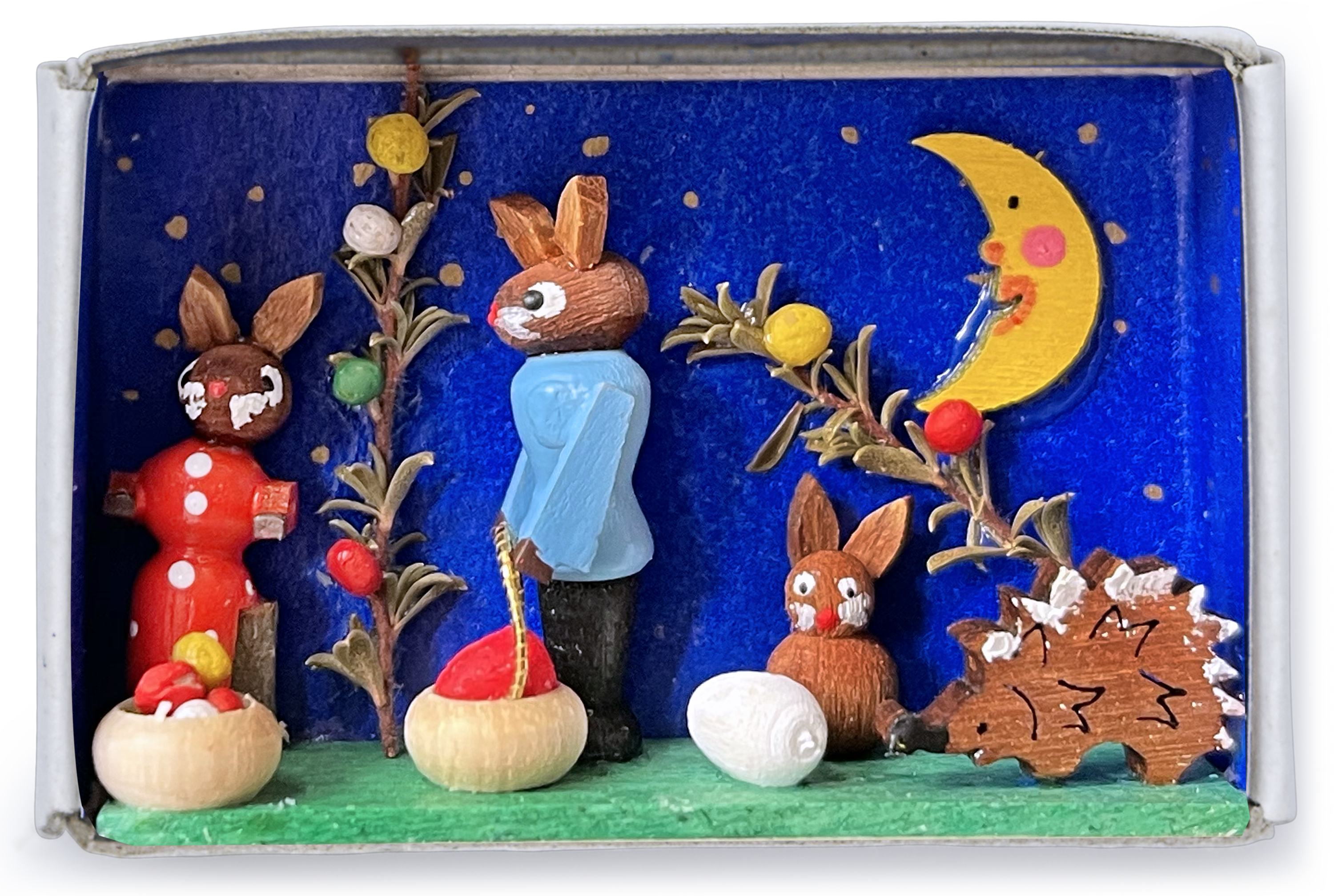 An incredibly detailed scene of rabbits hiding Easter eggs in a matchbox, this small delightful object is made entirely by hand. In the tradition of the Erzgebirge region in East Germany, wooden items relate to old European folklore themes and should be considered as such - halfway between outsider art and indigenous heritage. Buying an item such as this contributes to the continuation of such traditions.