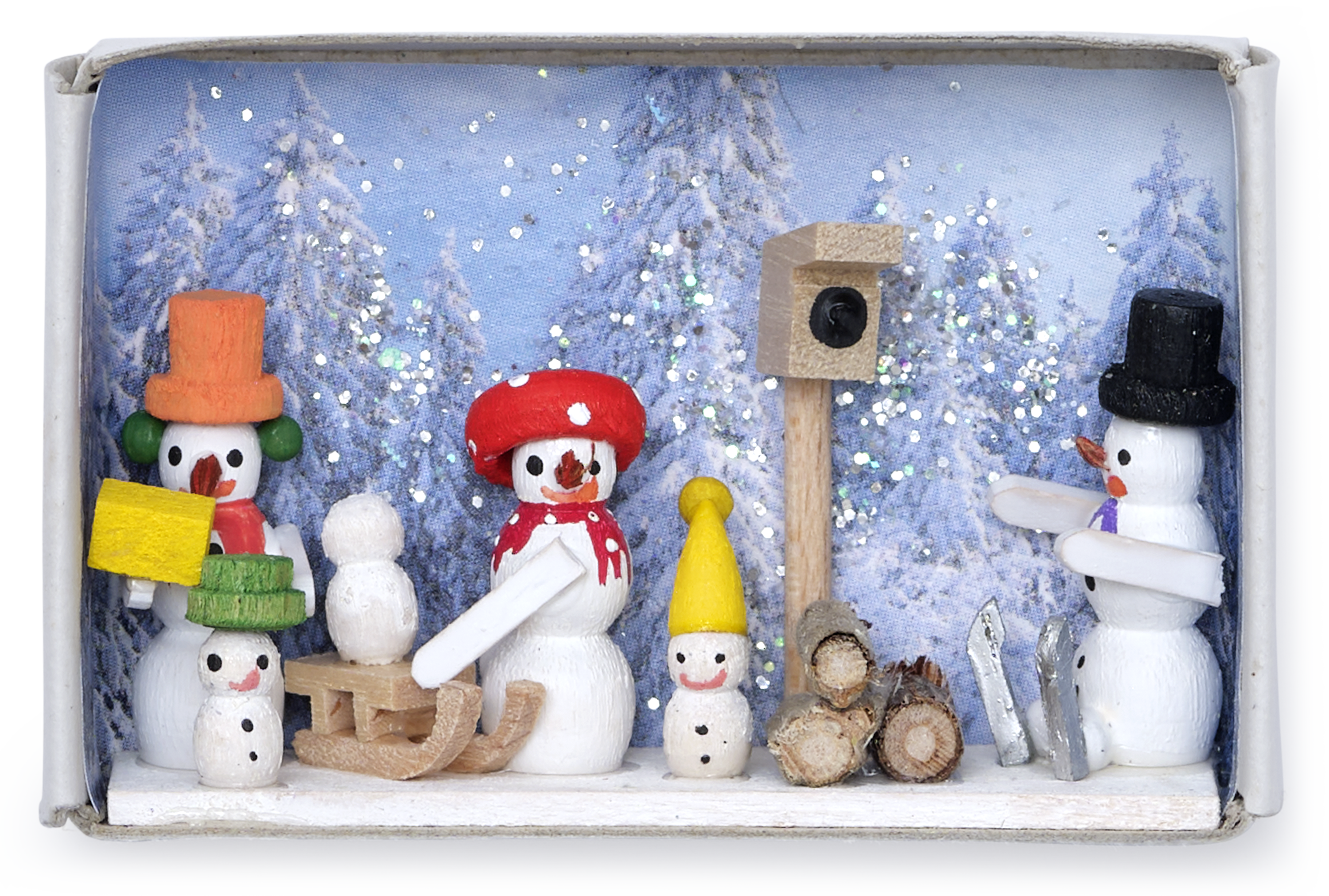 Wooden Miniature Matchbox Diorama, Snowman Family