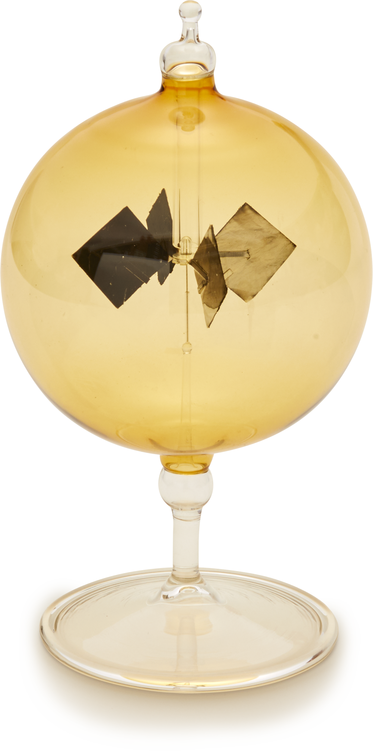 The Light Mill consists of an airtight glass bulb, containing a partial vacuum. Inside are a set of slate vanes which are mounted on a spindle. When exposed to sunlight, artificial light, or infrared radiation, the vanes turn with no apparent motive power, the dark sides retreating from the radiation source and the light sides advancing. The increase of light/heat intensity will result on a faster rotation, providing a quantitative measurement of electromagnetic radiation intensity.